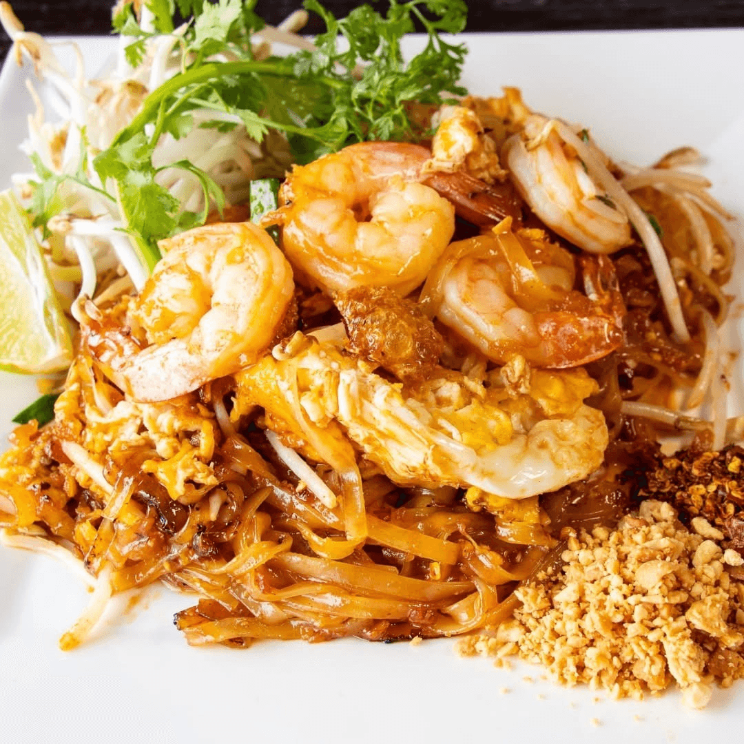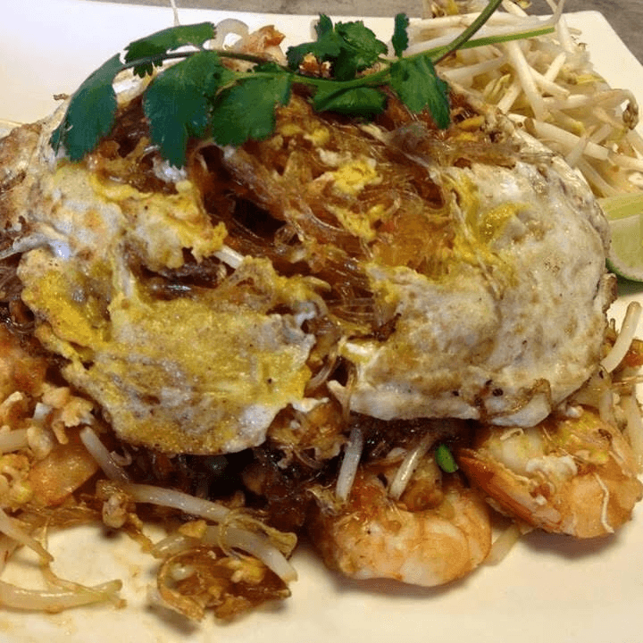 Glass noodles, chili, bean sprouts, chive, egg, peanuts.