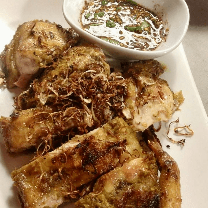 Marinated half chicken, sweet chili sauce, and chili salsa sauce.