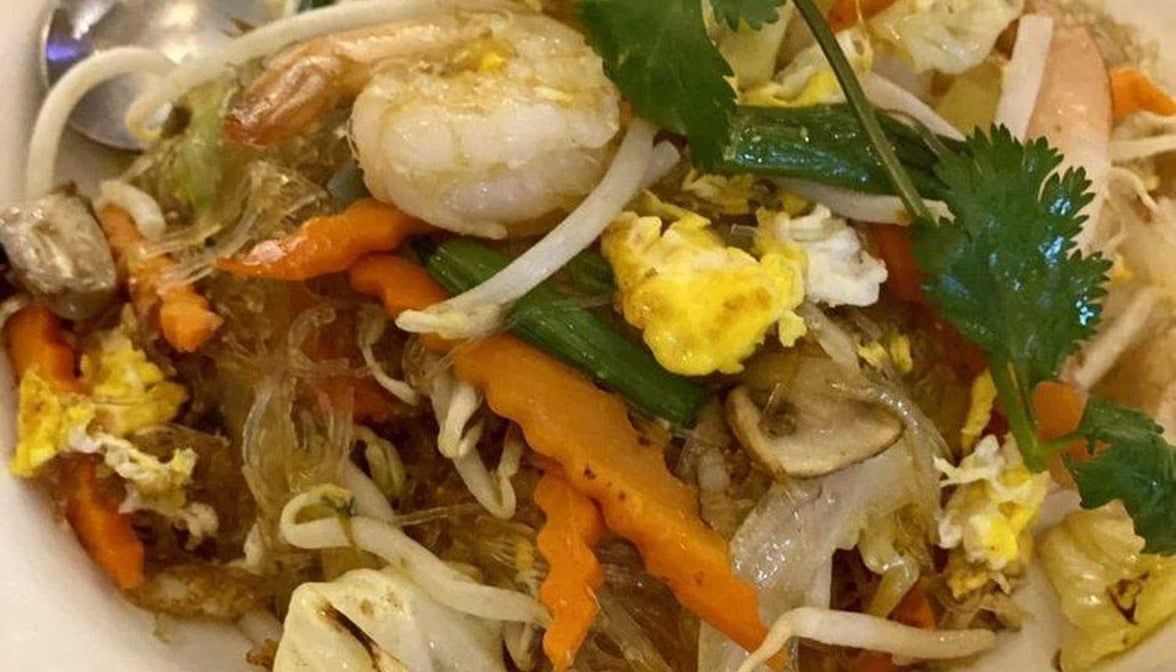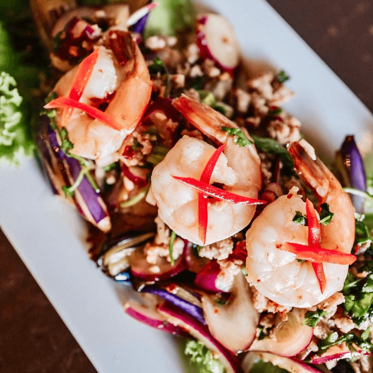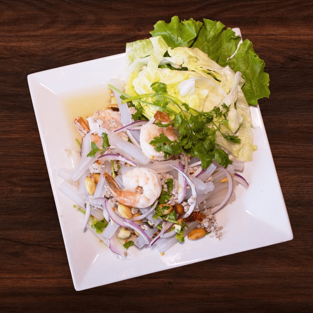 Glass noodle salad, mixed with shrimp, minced pork, scallion, red onion, and lime chili sauce.