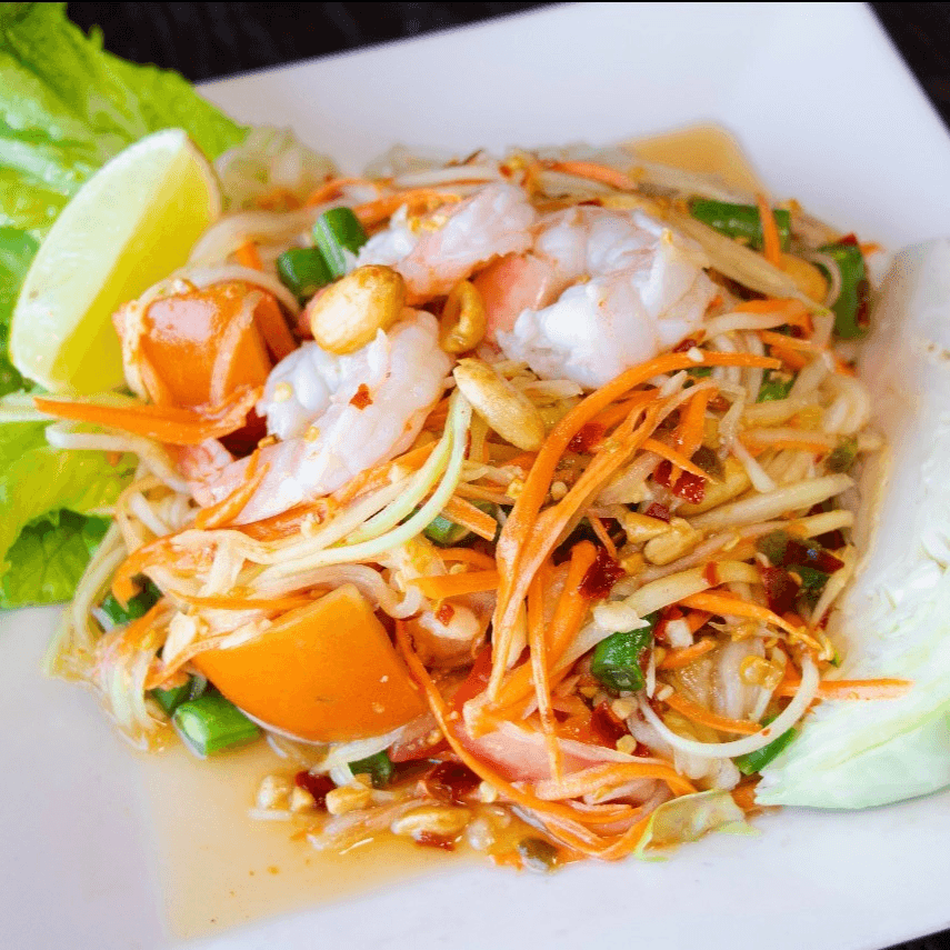 Green papaya, carrot, green beans, shrimp, peanut, chili, and tamarind lime sauce.