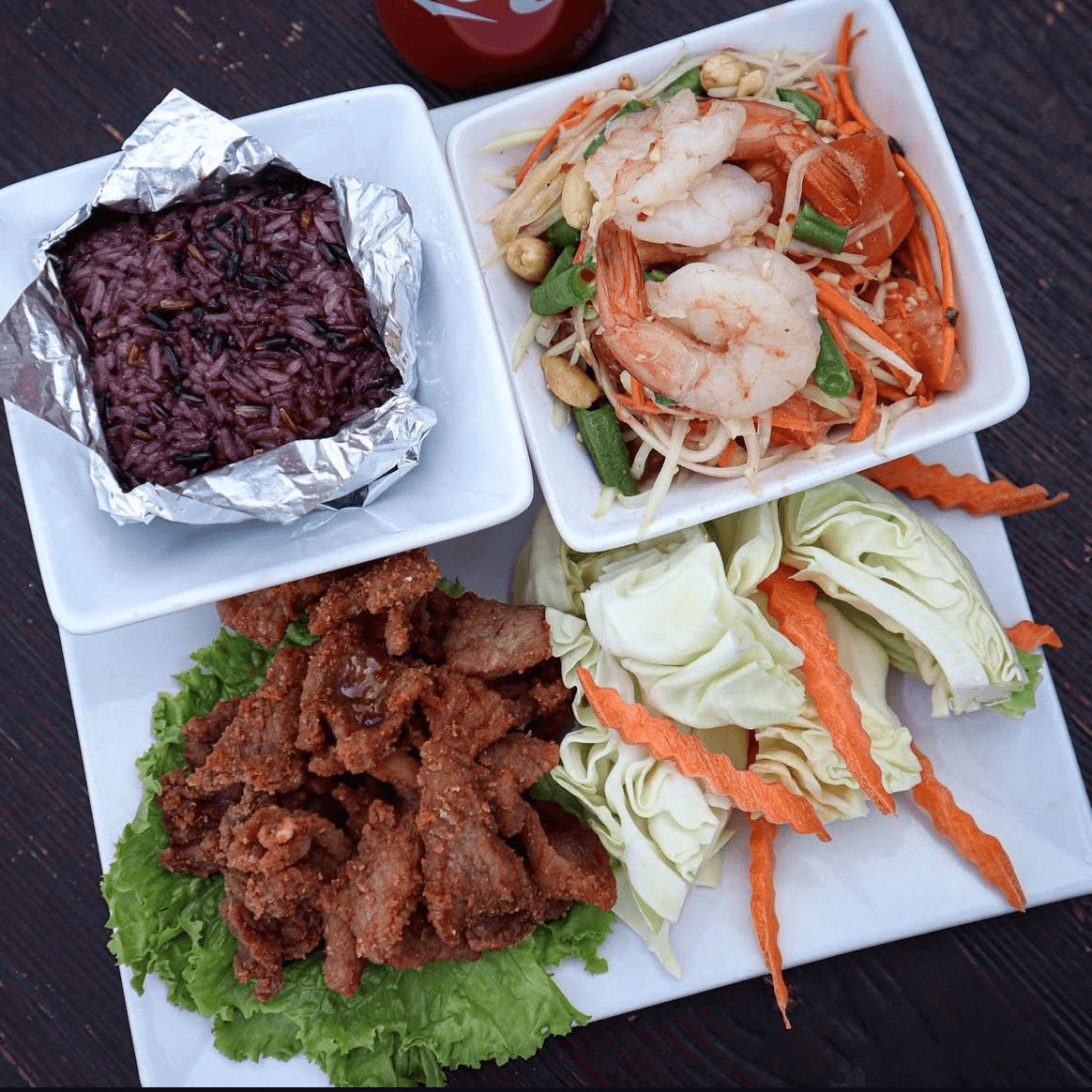 Papaya salad, choice of pork, chicken or beef jerky, and black sticky rice.
