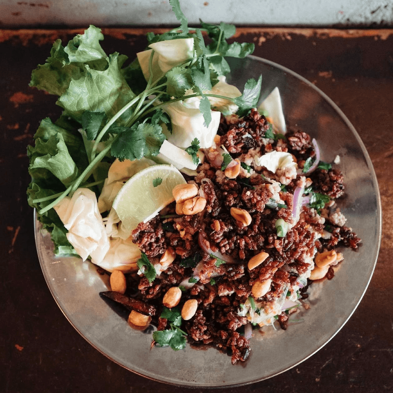 Mung bean noodle, ground pork, shrimp. Red onion, peanut, cilantro, iceberg lettuce, and garlic lime chili dressing.