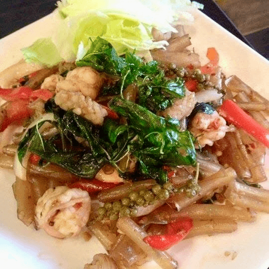 Mung bean noodles, green peppercorn, red chili paste, and basil with iceberg lettuce.