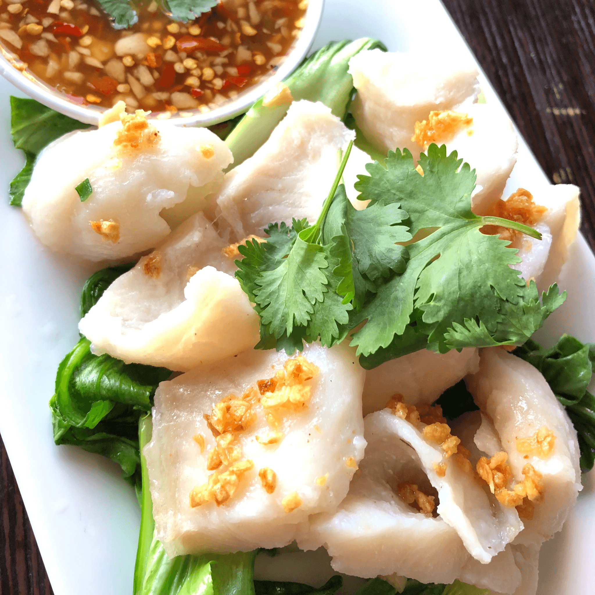 Steamed sole fish filet, steamed bokchoy. And toasted garlic with chili lime dipping sauce.