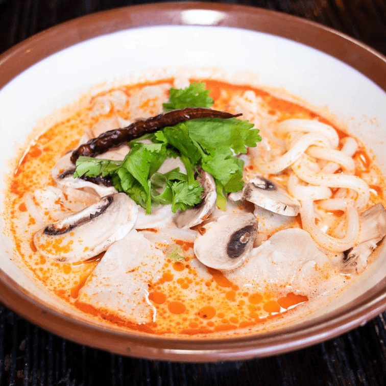 Udon, coconut lemongrass lime chili broth, mushroom, and galangal.