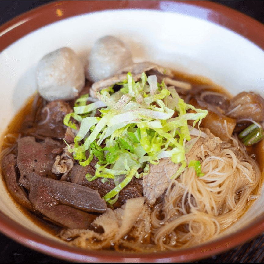 Rare beef, braised beef, meatball, tripe, tendons, and liver with bean sprouts and scallion.