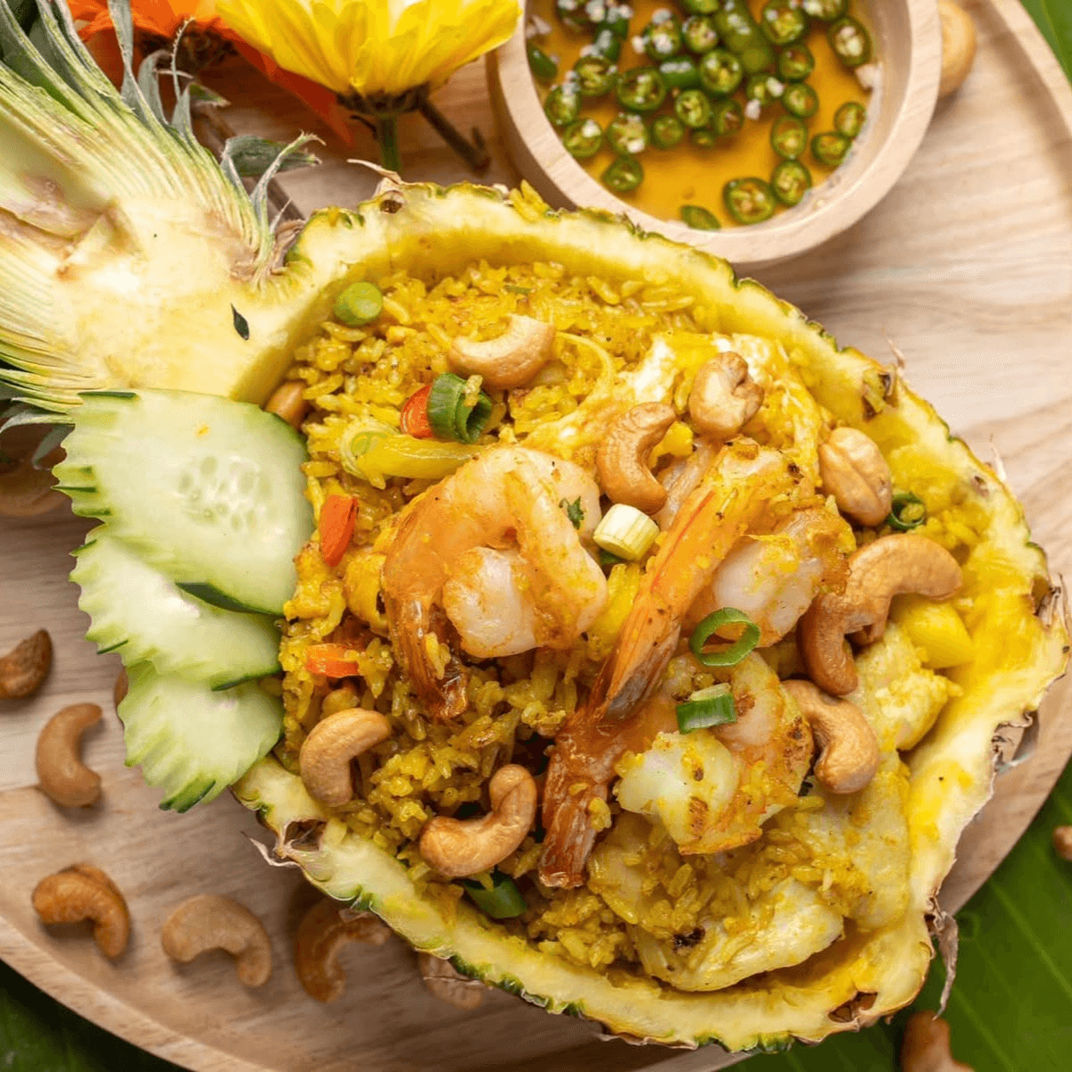 Curry fried rice, chicken, shrimp, pineapple, egg, cashew nuts, raisins, onion, and bell peppers.