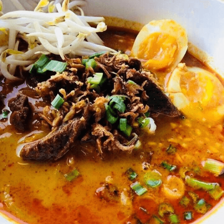 Small rice noodles, light curry broth, bean sprouts, crushed peanuts, fried shallots, boiled egg, and scallion.