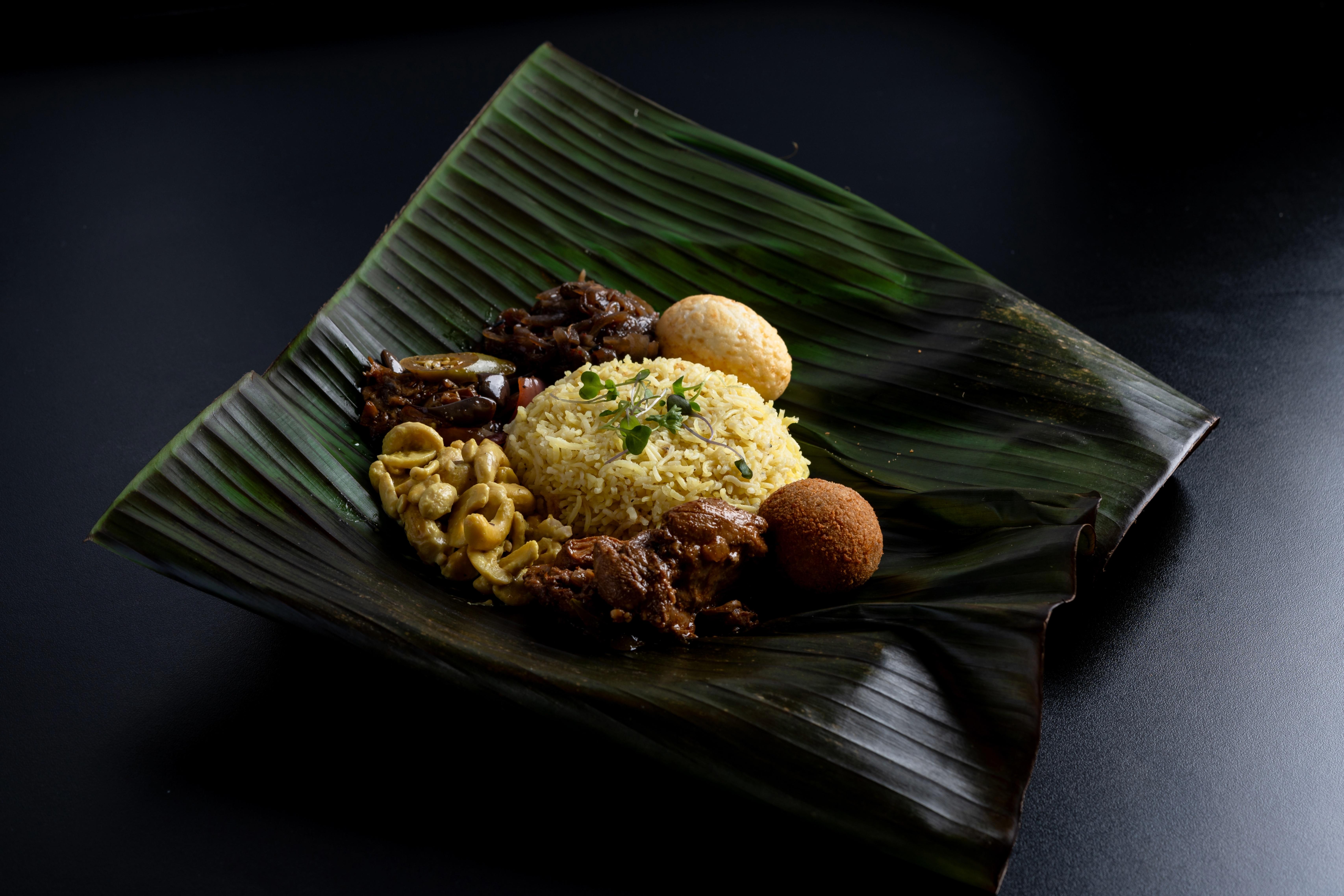 Yellow Rice, Eggplant Moju, caramelized onion, cashew curry, boiled egg, and fish croquette all wrapped in a banana leaf, with a choice of Chicken, beef (+$2), lamb (+$4), or shrimp (+$3)