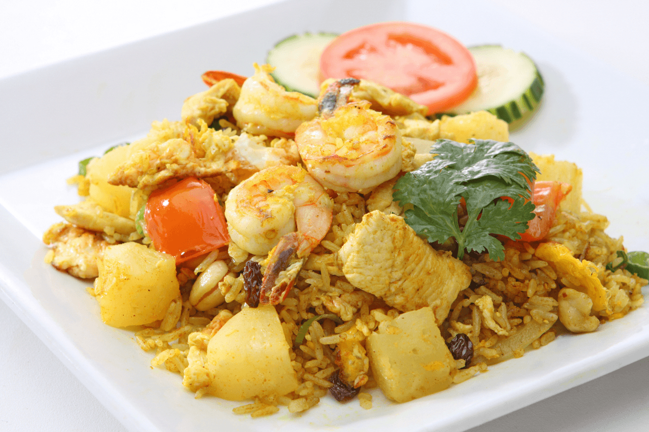 Fried rice with pineapple raisin, cashew nuts, onion, and curry powder.
