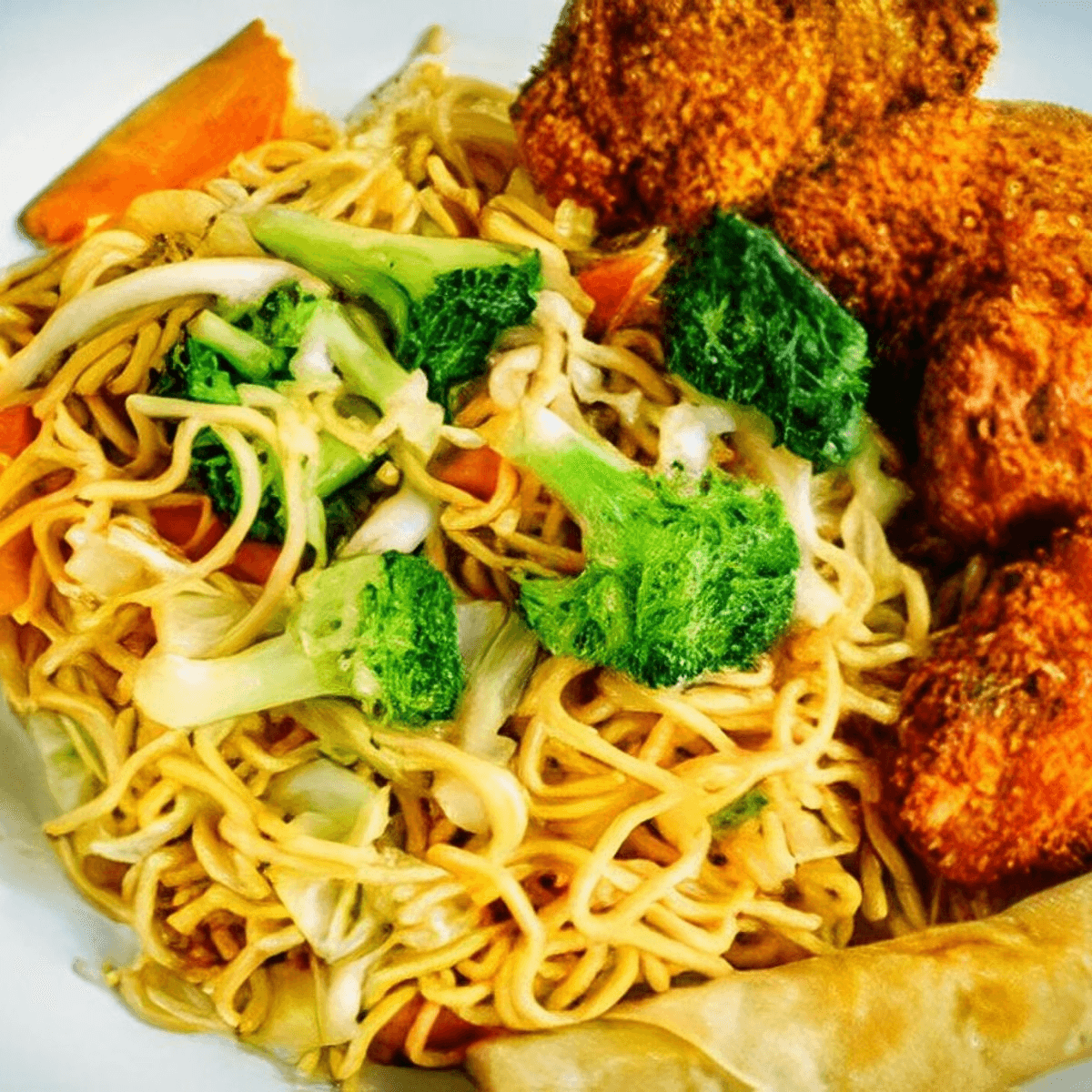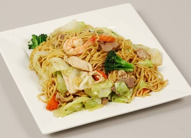 Chow mein with BBQ pork or BBQ beef and egg roll.