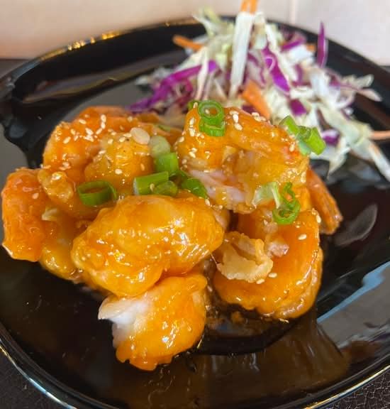 10 pieces. Juicy shrimp in a tangy orange sauce, offering a burst of citrus flavor in every bite.