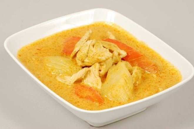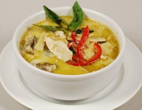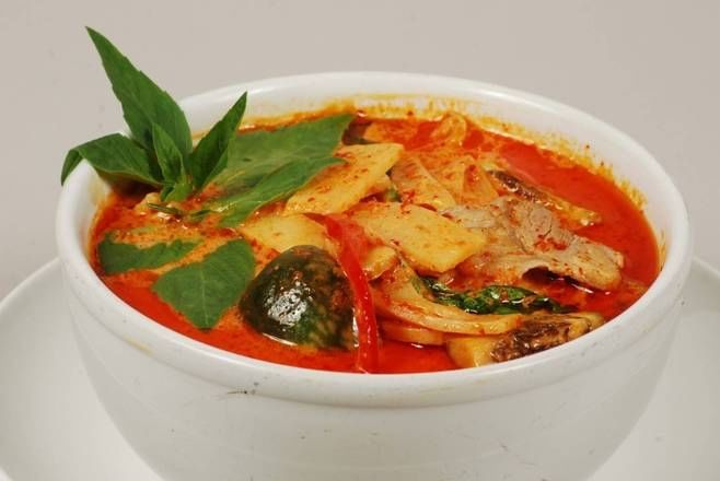 Served with bamboo shoots, Thai eggplant, chili, basil leaves, and coconut milk.
