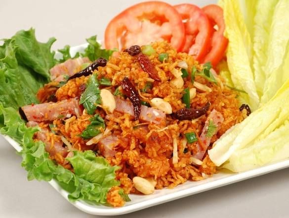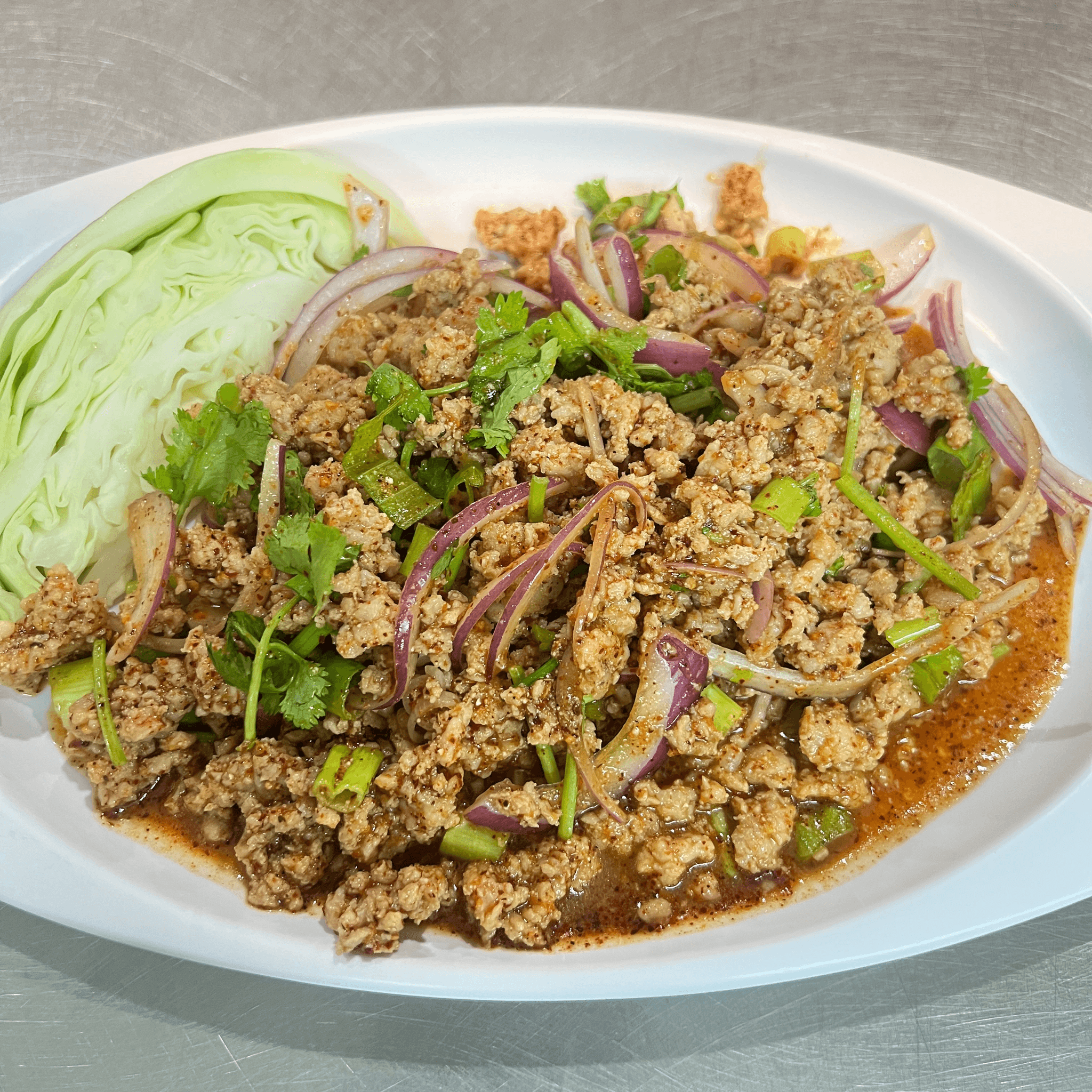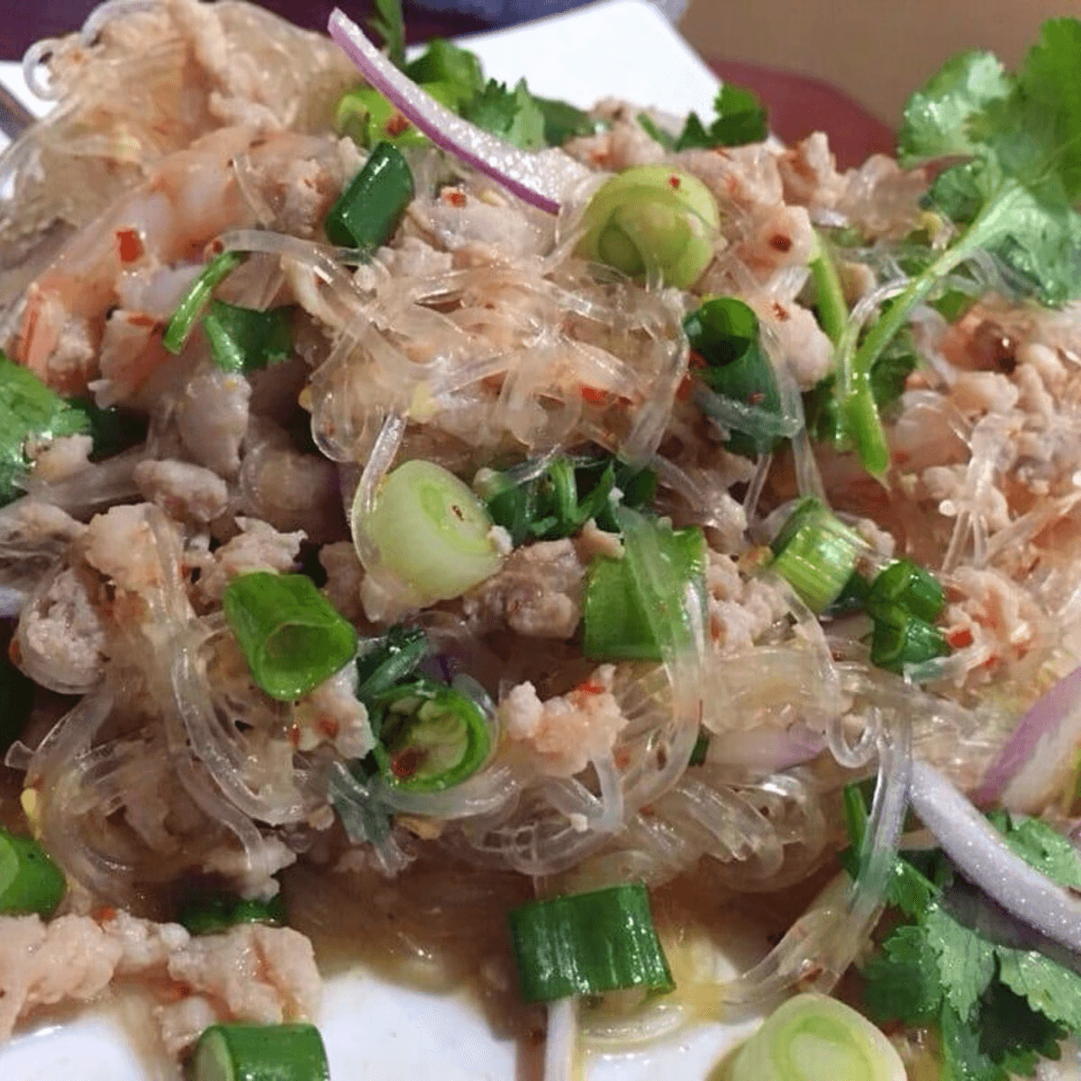 Glass noodle, ground pork, shrimp, onion, tomato, chili, and lime juice. Spicy.