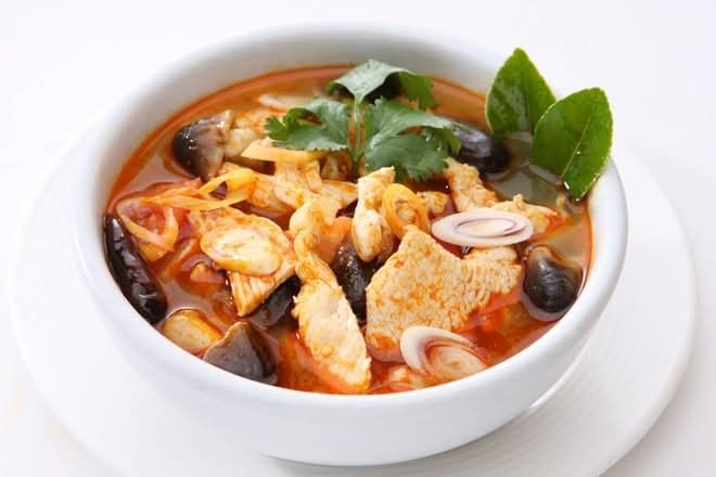 Hot and sour soup with chicken, mushroom, lemongrass, chili and red chili paste.