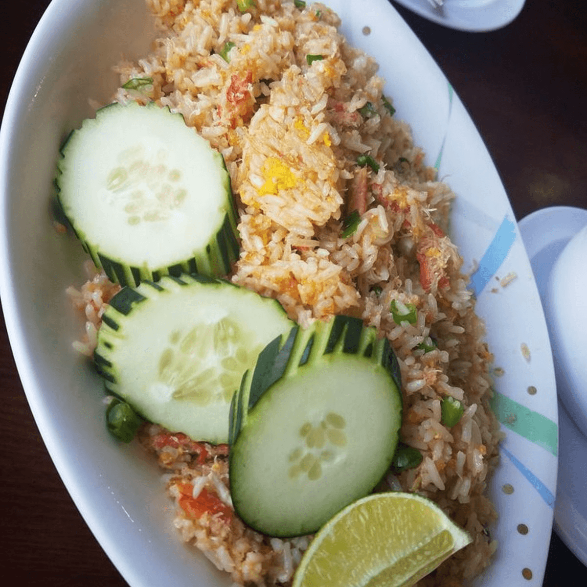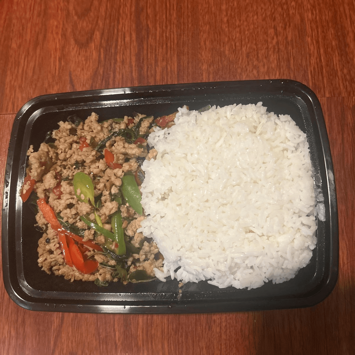 Fried rice with choice of pork or chicken, basil, bell pepper, and chili.