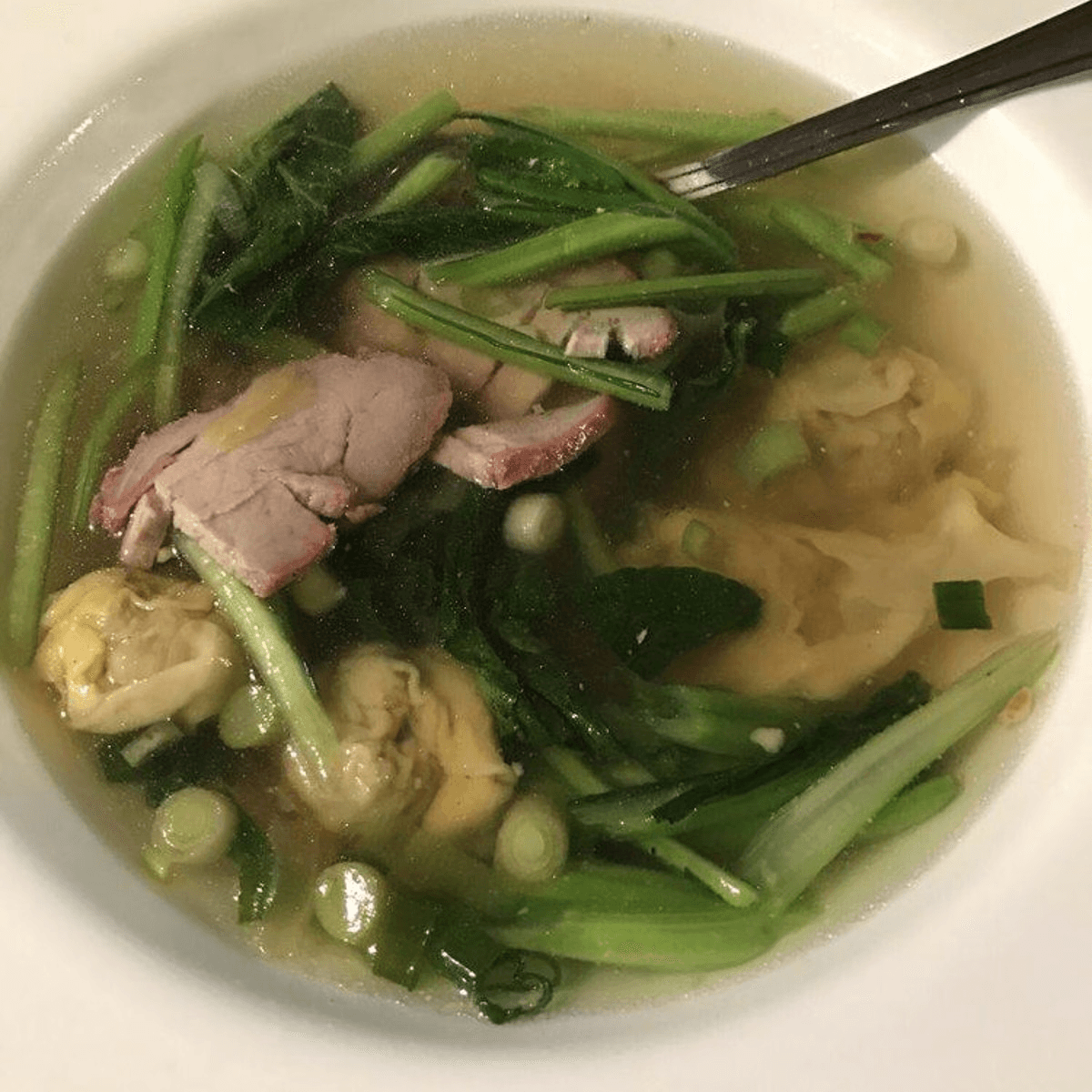 Shrimp wonton in clear soup with yu choi, green onion, cilantro.