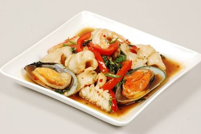Stir-fried with chili, basil leaves, and garlic on rice.