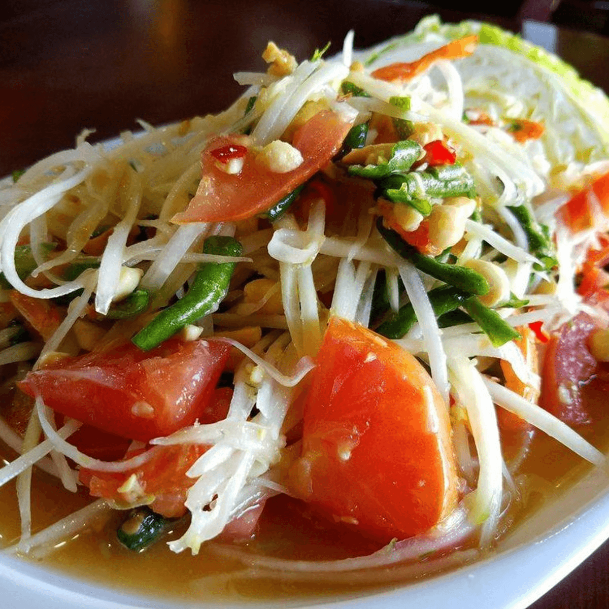 Green papaya with dried shrimp, peanut, tomato, chili, garlic, and lime juice.