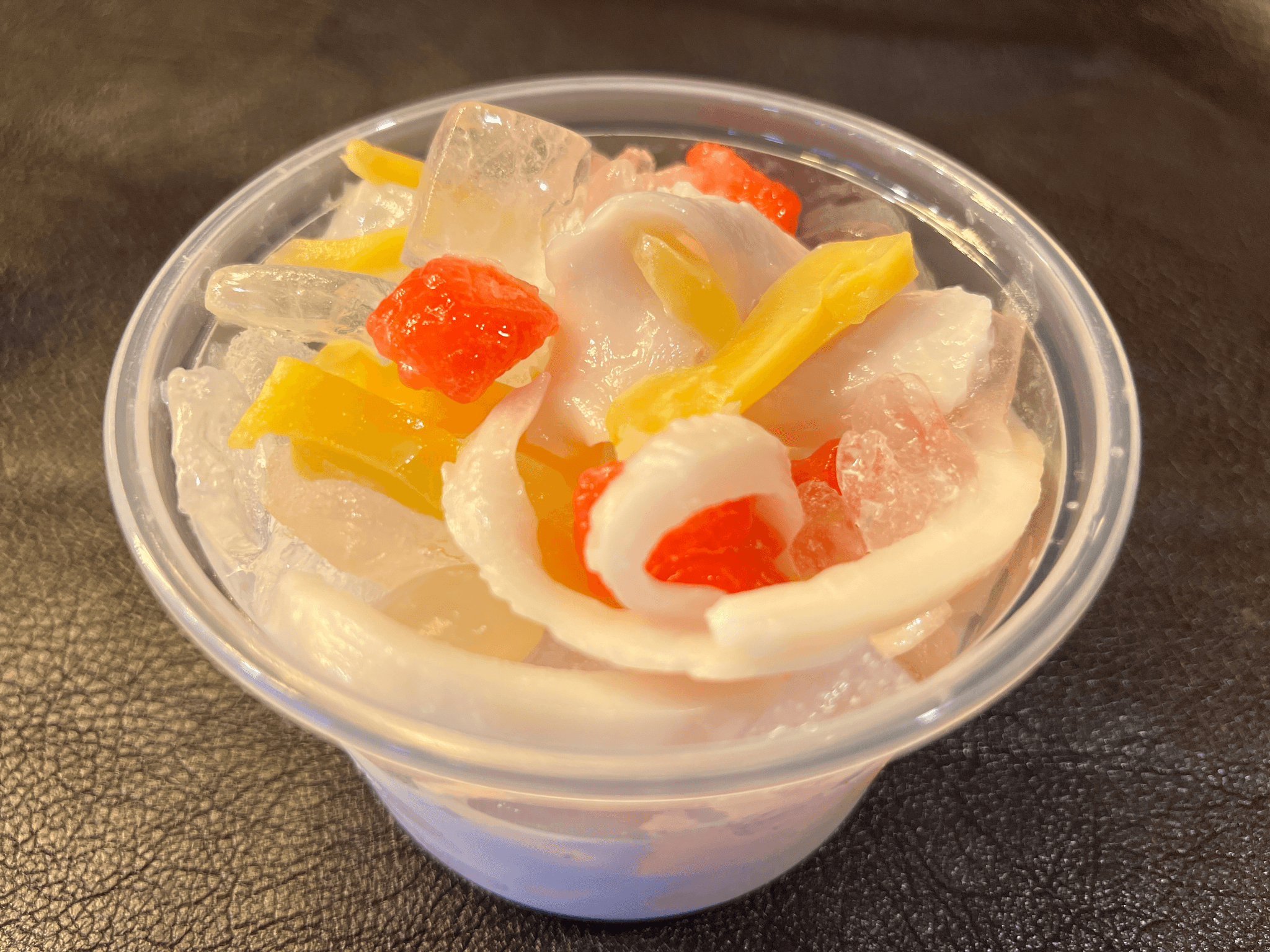 Small portion of Sweet mango chunk (can) dessert with a tropical twist, perfect for a refreshing end to your meal.