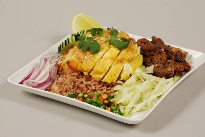 Shrimp paste fried rice topped with sweet pork, dry shrimp, egg, cucumber, and red onions.