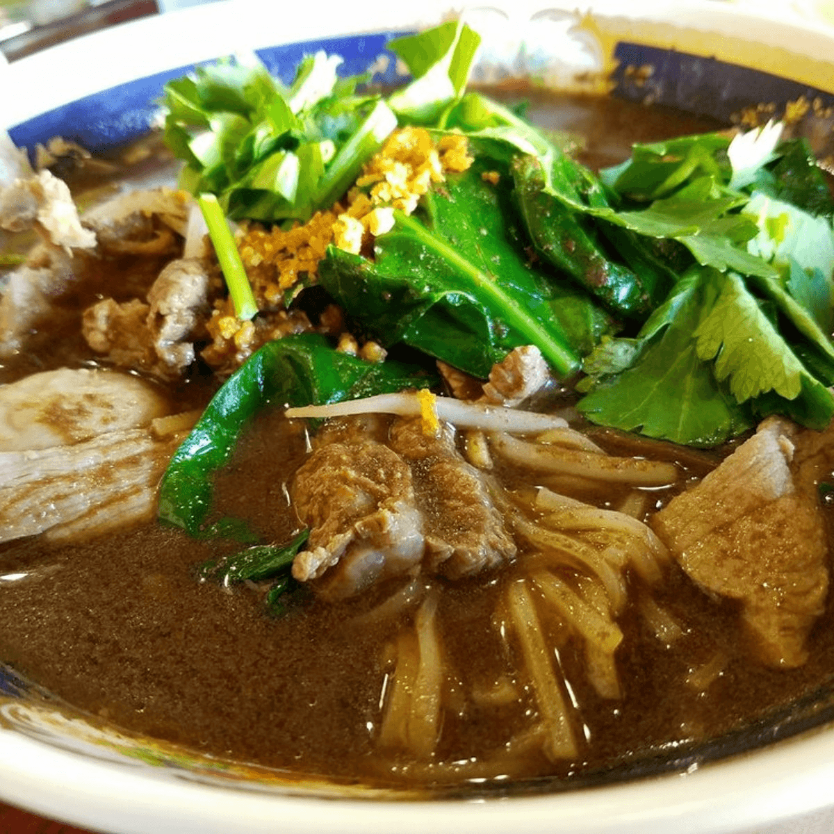 Noodles with pork or beef stew and bean sprout in dark soup.