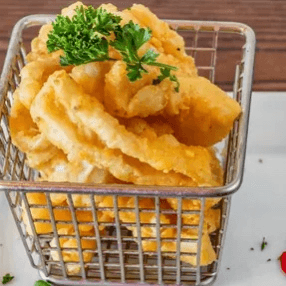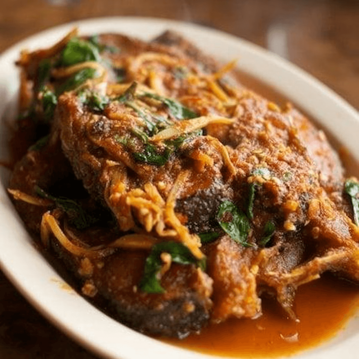 Stir-fried crispy catfish in chili paste, shredded finger root and galangal. Topped with fresh basil for aroma.