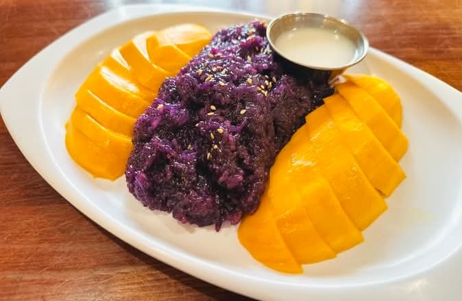 Seasonal.Fresh 🥭 mango serve with sweet sticky rice and coconut sauce.