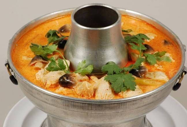 Hot sour soup with chicken, coconut milk, mushroom, lemongrass, and chili.