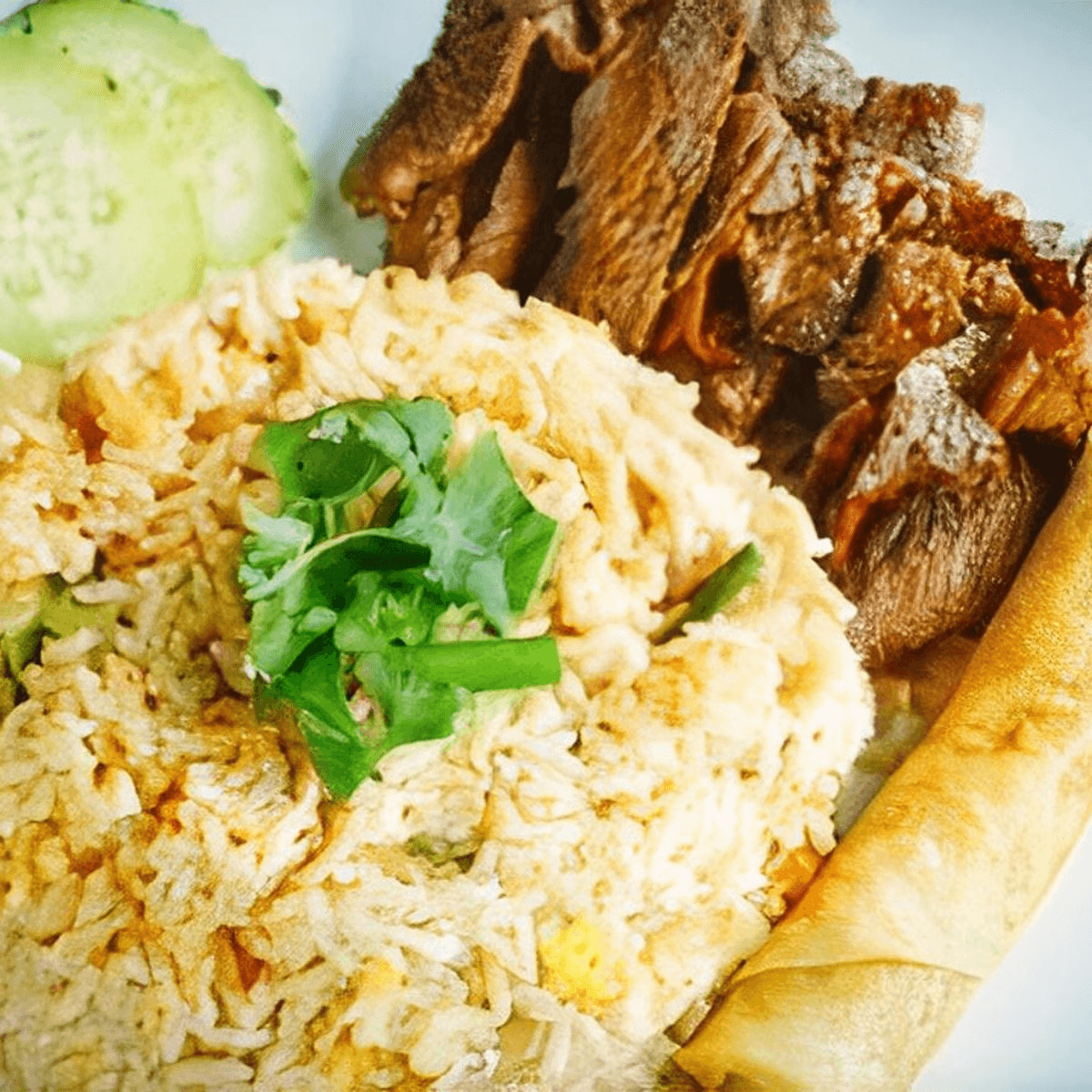 Fried rice with choice of pork, beef, chicken, egg, onion, and tomato.