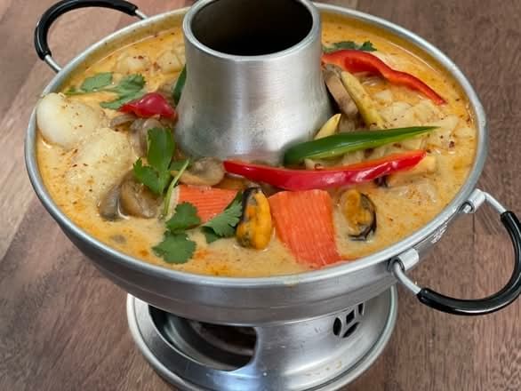 The hot sour soup comes with shrimp, fish, squid, mussel, imitation crab, mushroom, lemongrass, chili, and coconut milk.