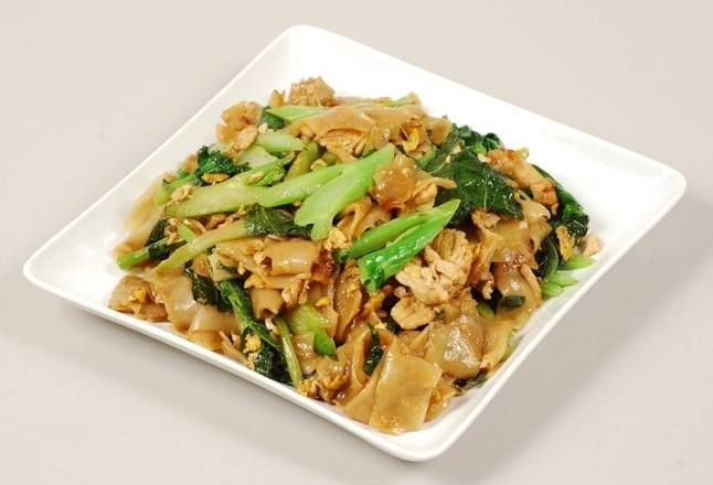 Stir-fried flat noodle with egg, Chinese broccoli, and oyster sauce.