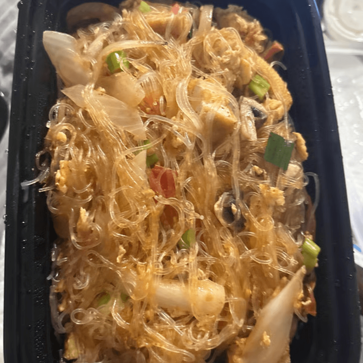 Stir-fried glass noodle with chicken, pork, beef, shrimp, egg, onion, tomato, and carrot.