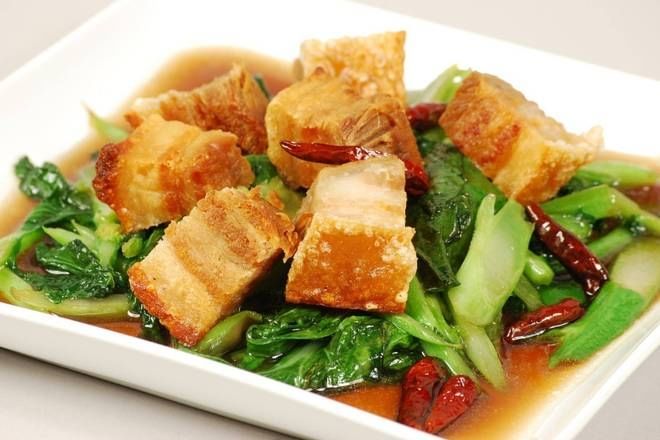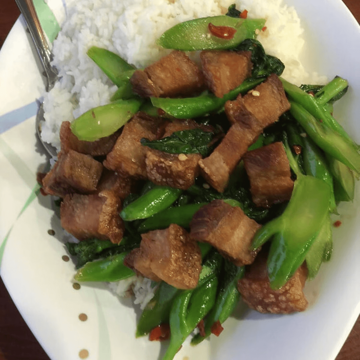 Stir-fried Chinese broccoli paired with crispy pork. Served over a bed of rice.