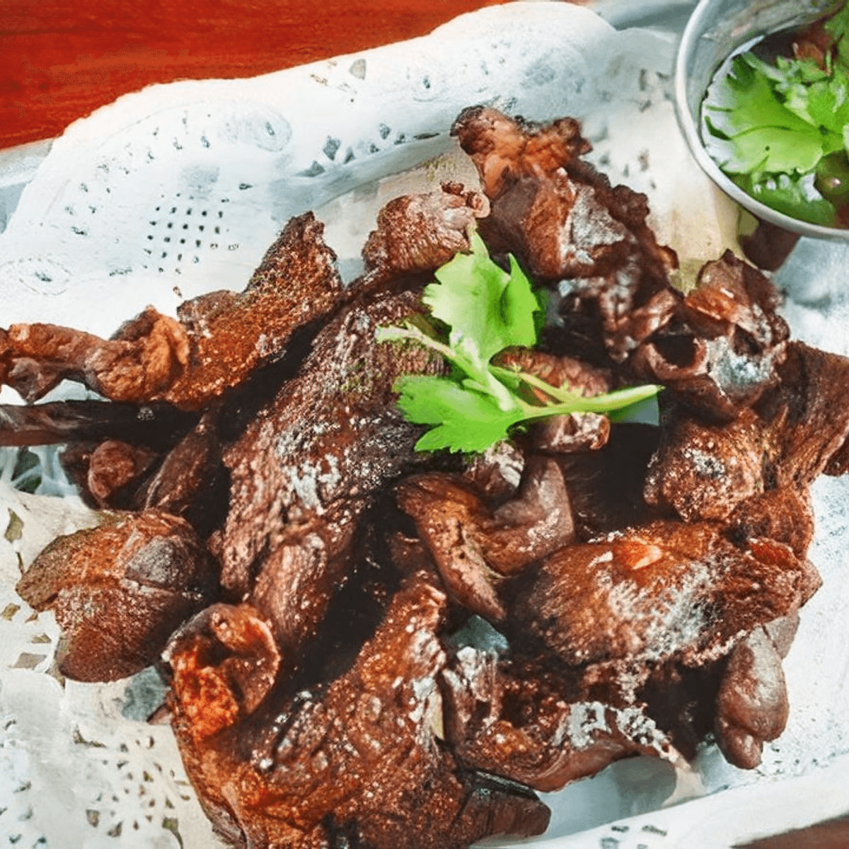 Boiled squid, onions, chili, and lime over a bed of lettuce. Spicy.