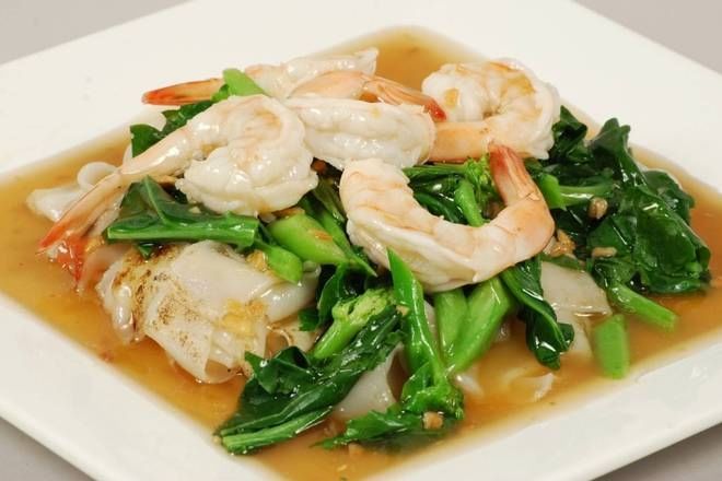 Fried flat noodles with Chinese broccoli and topped with gravy.