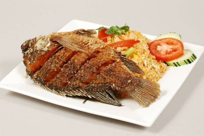Deep-fried tilapia with spicy chili sauce, basil leaves, and bell pepper.