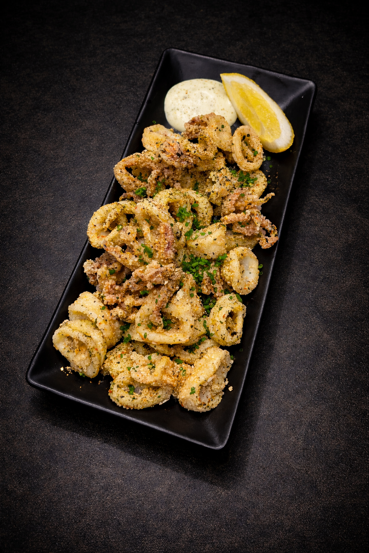 Crispy fried calamari tossed in savory furikake seasoning, served with a fresh lemon wedge and creamy wasabi aioli.