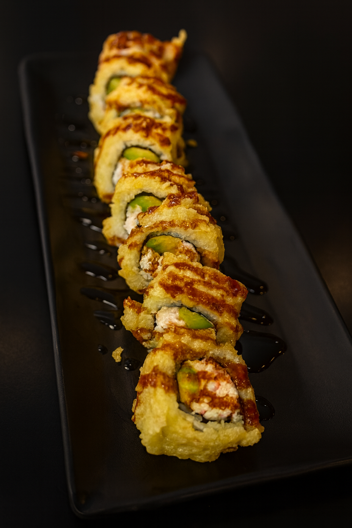 Baked Salmon, Crab Meat, and Avocado. Deep Fried with Eel Sauce Drizzle.