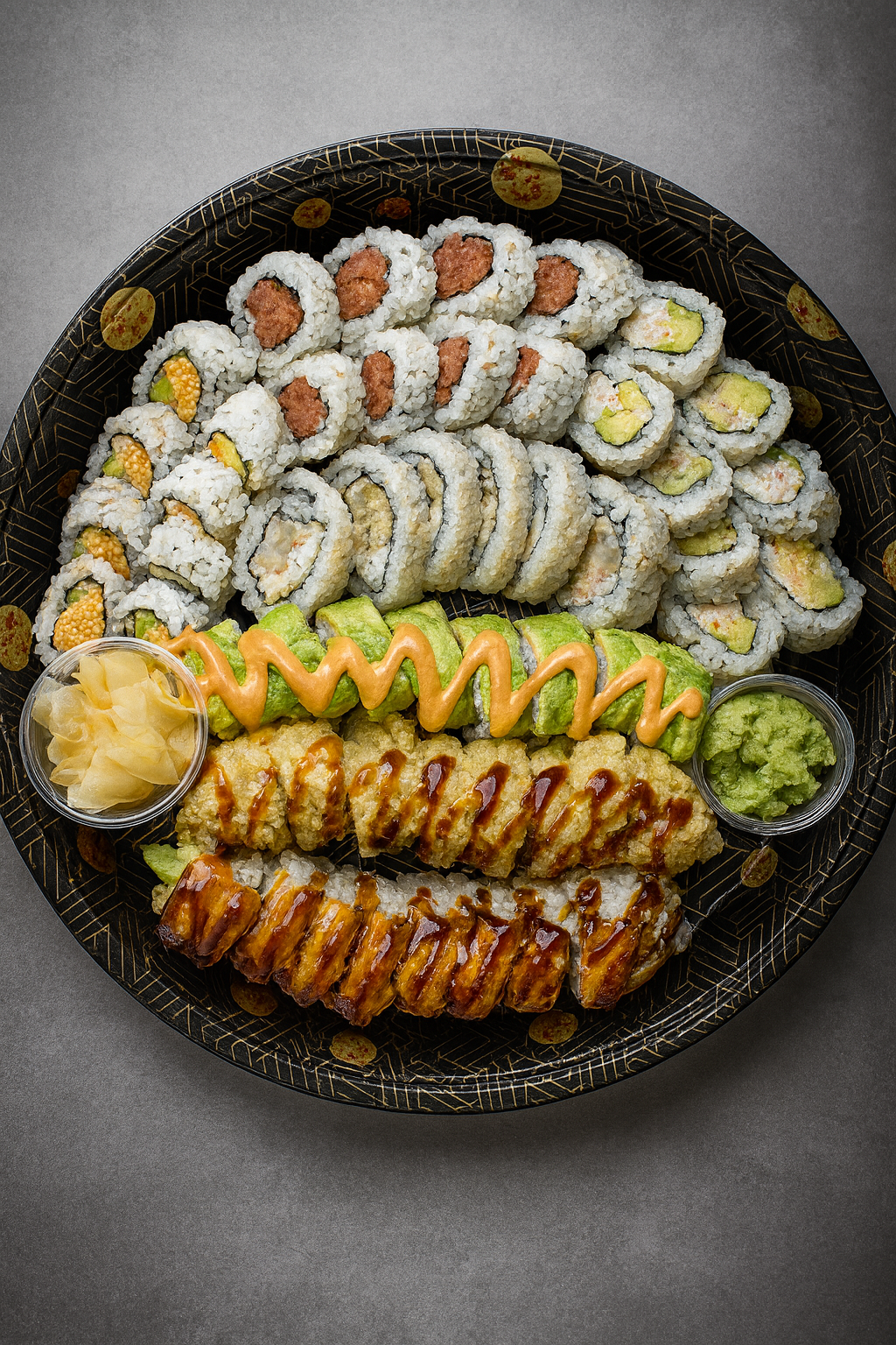 Shrimp Tempura, spicy tuna, avocado topped with shrimp sashimi, masago, tempura crunch, eel sauce, and spicy mayo