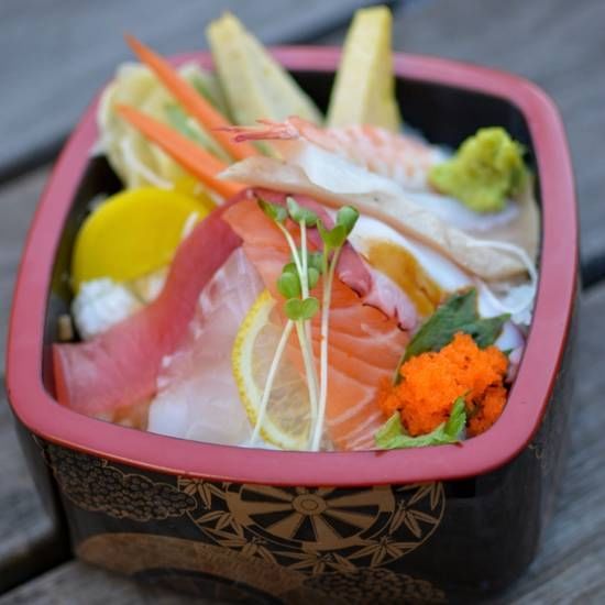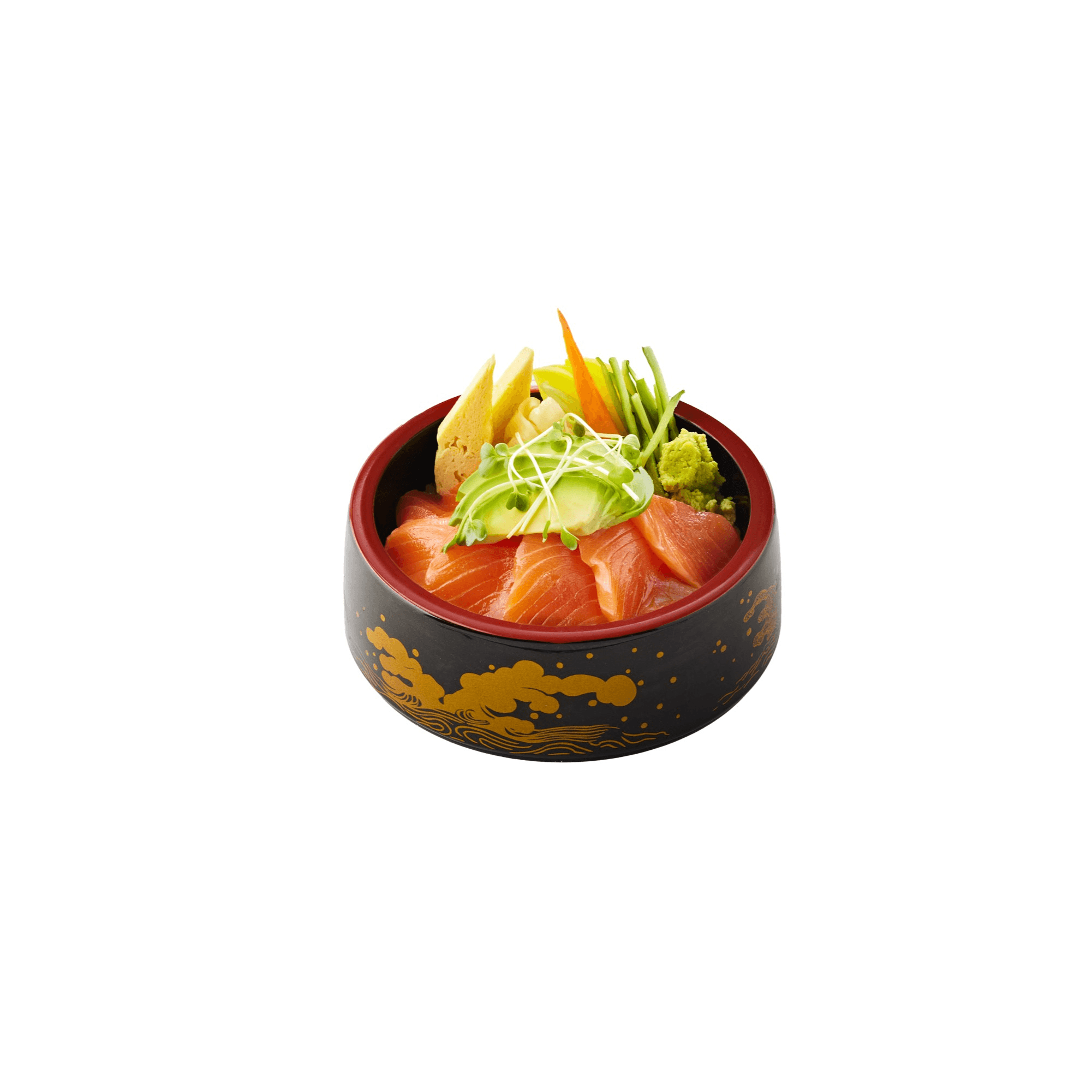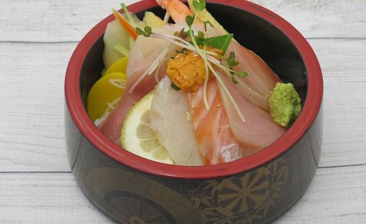 Fresh salmon mixed with original sauce with seaweed, shredded red pepper, lettuce, sliced radish, carrots, red radish, bell pepper, sesame seed and kaiware sprout. Comes with ginger dressing