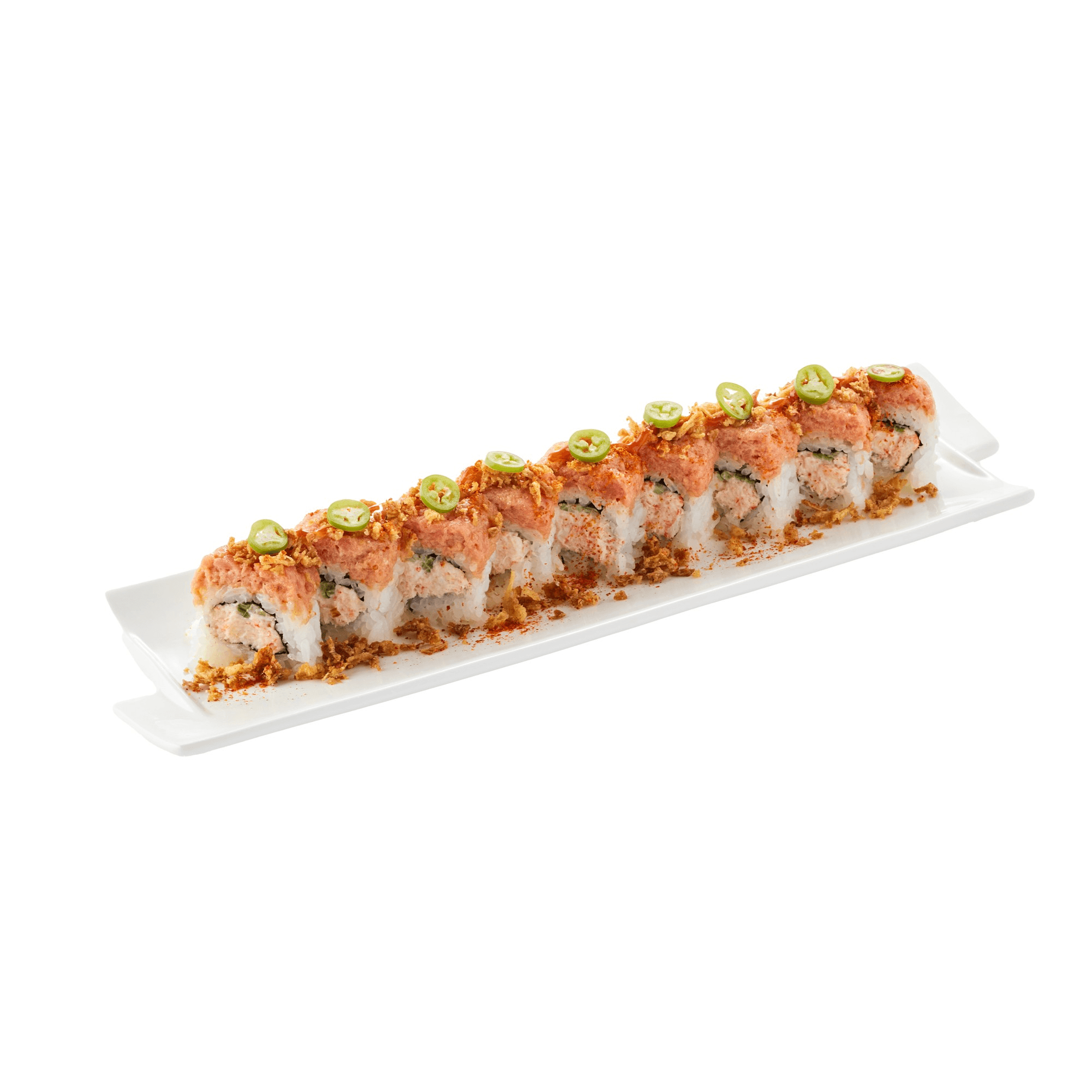 10 pieces. California with spicy tuna with jalapeno, sriracha, kaiware sprout, fried onion
