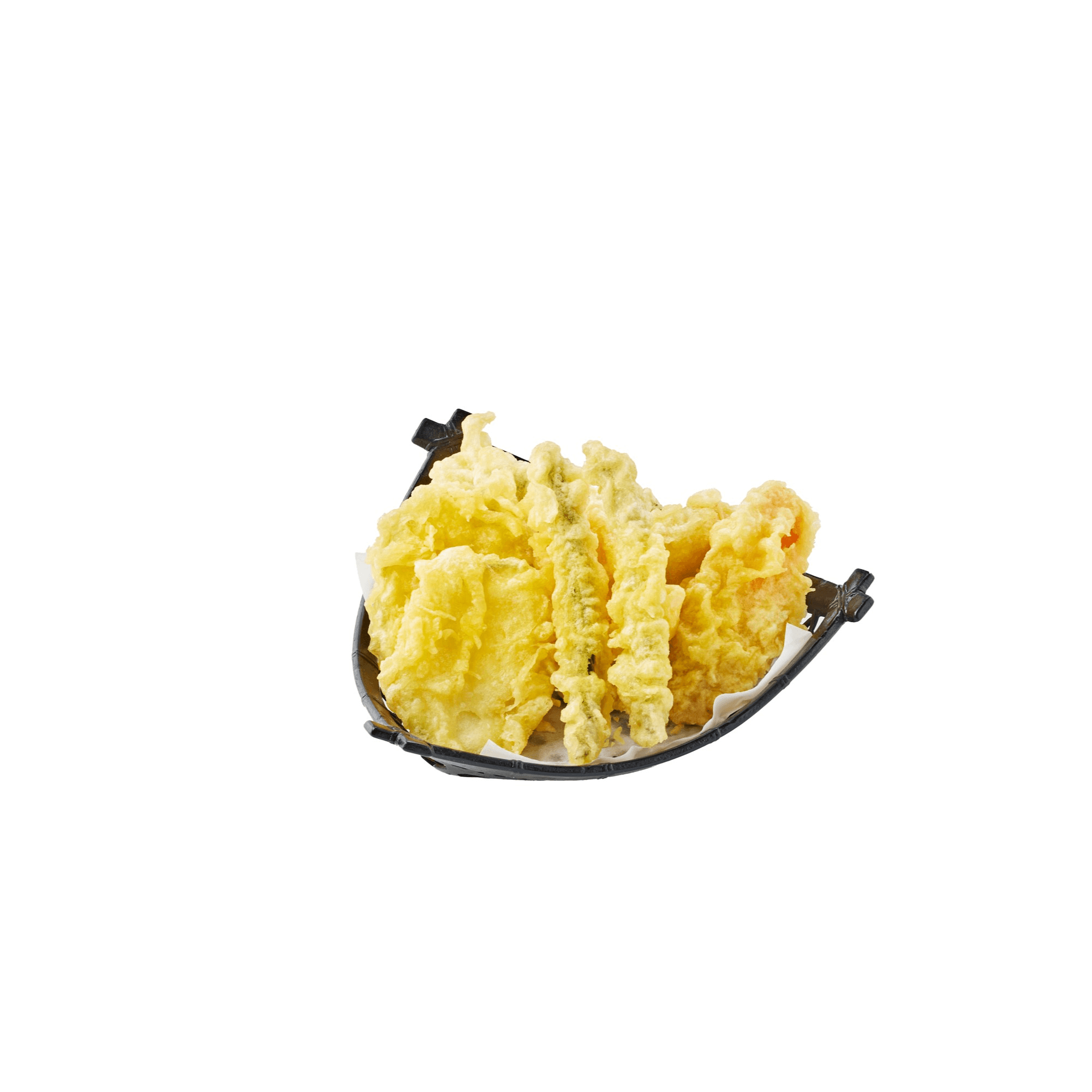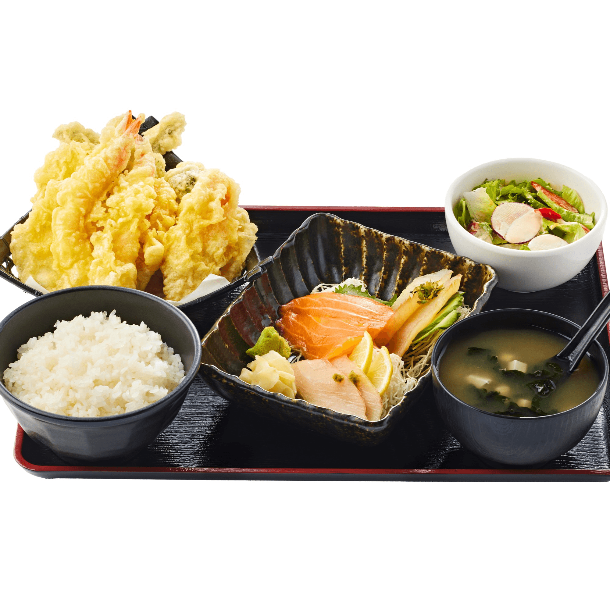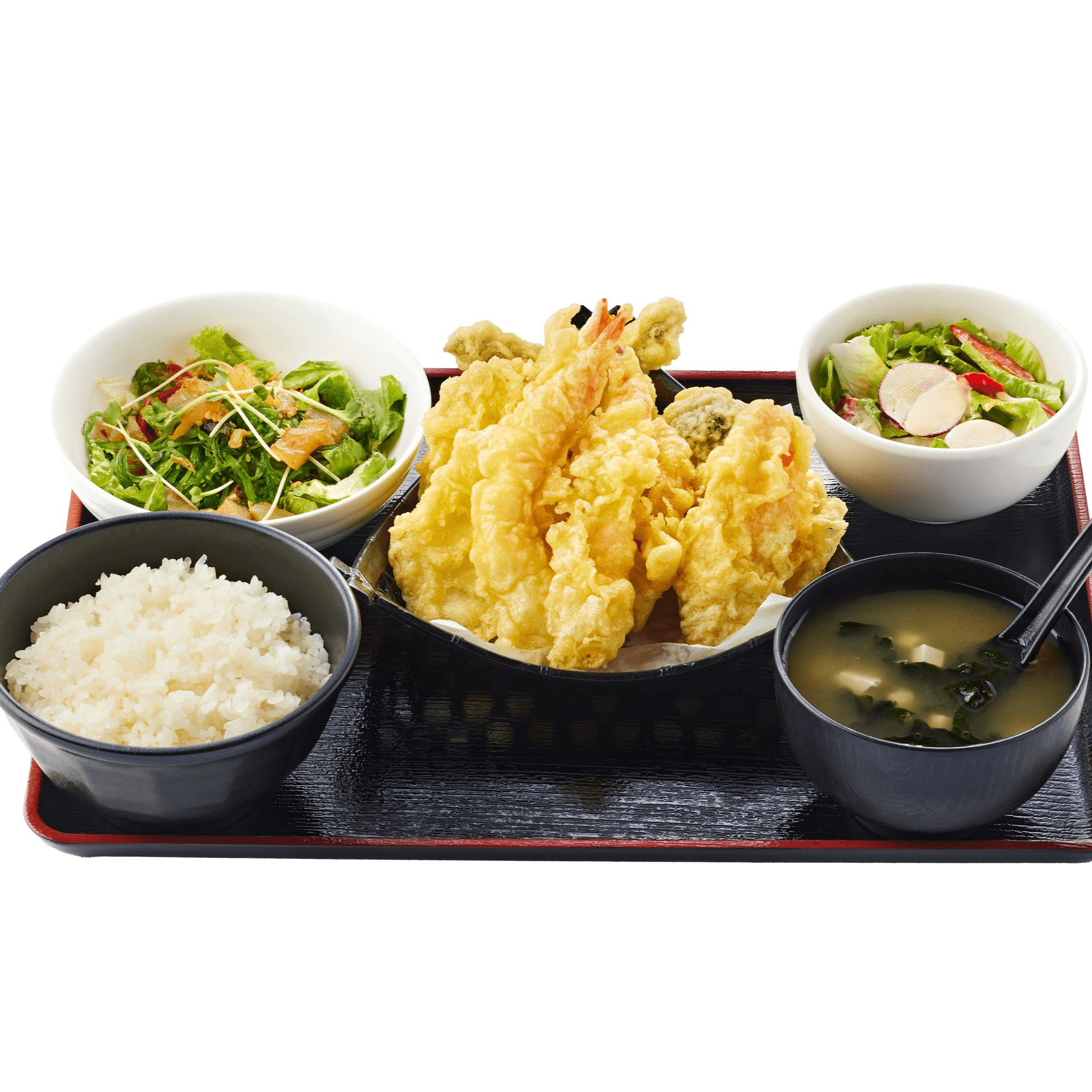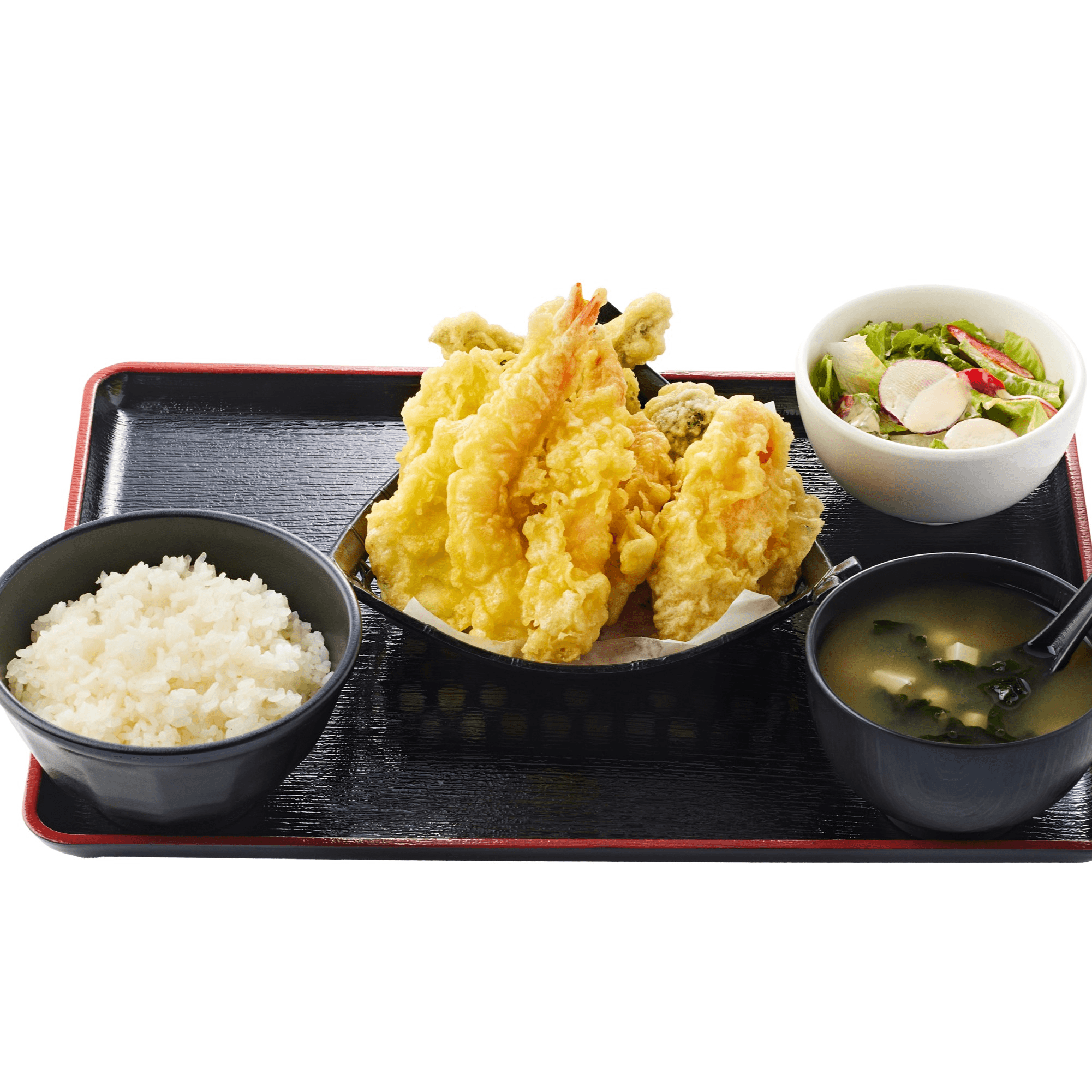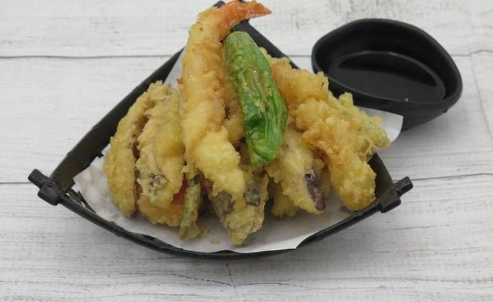 2 pieces of shrimp and assorted vegetables ( zucchini, potato, carrots, string beans and eggplant). Comes with miso soup, rice, mini salad