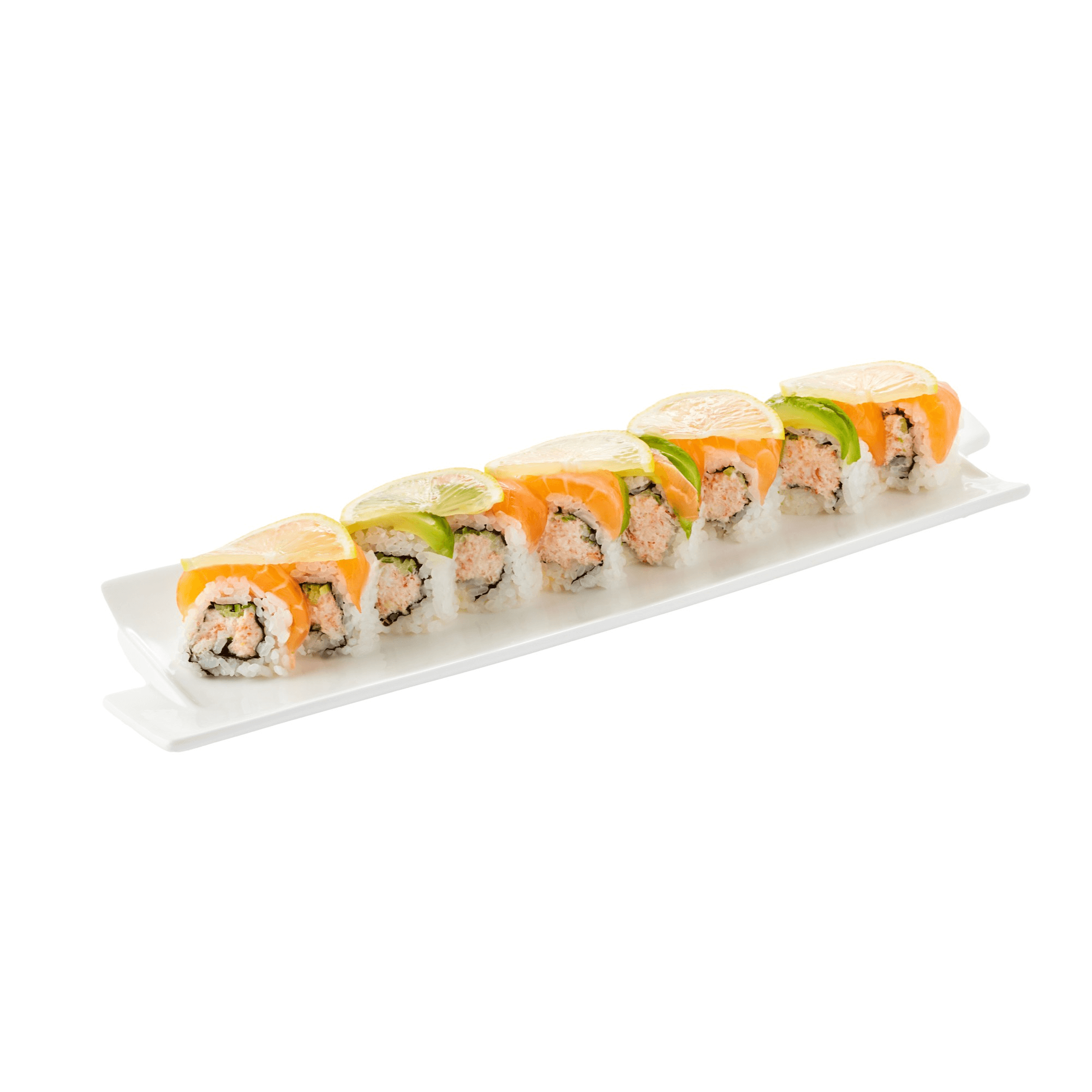 10 pieces. California with salmon and avocado, sliced lemon, kaiware sprout