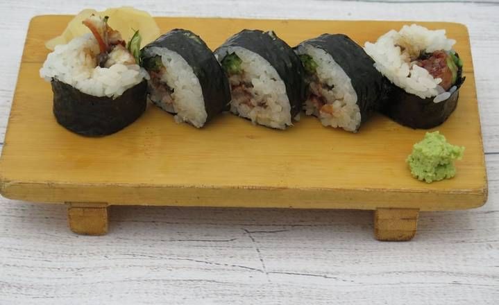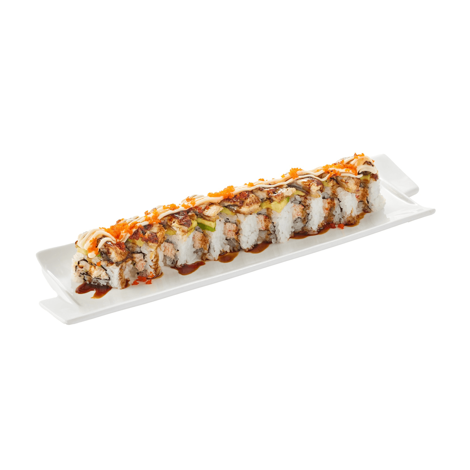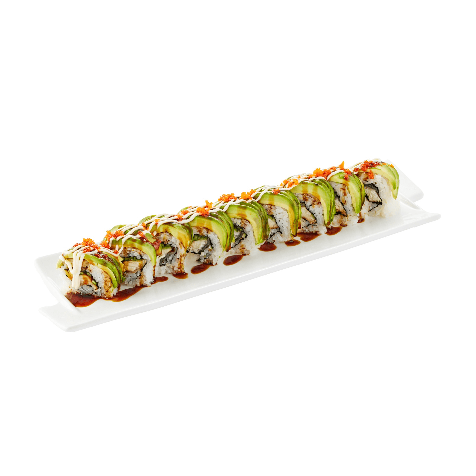 10 pieces. Eel and cucumber base with avocado, eel sauce, mayonnaise, masago