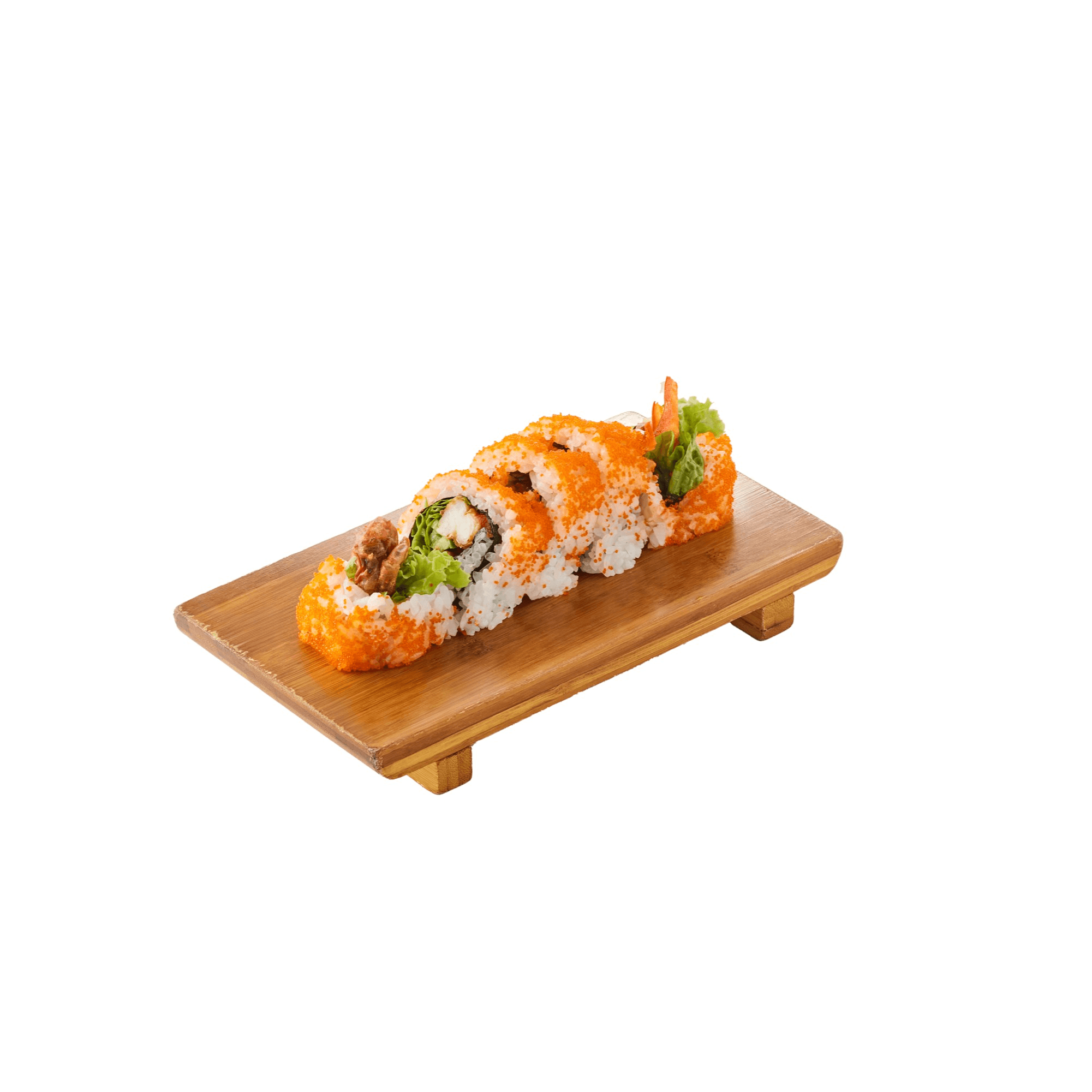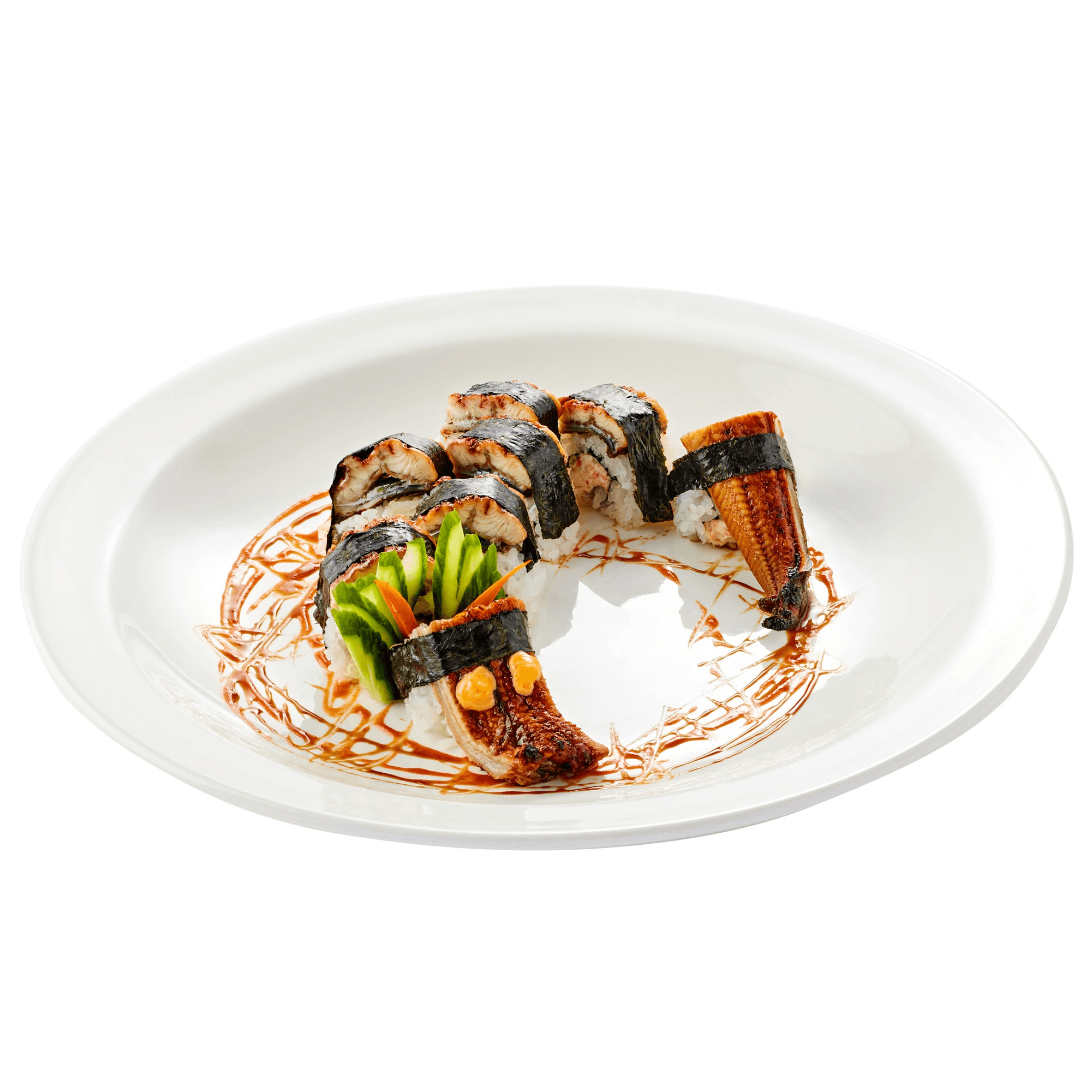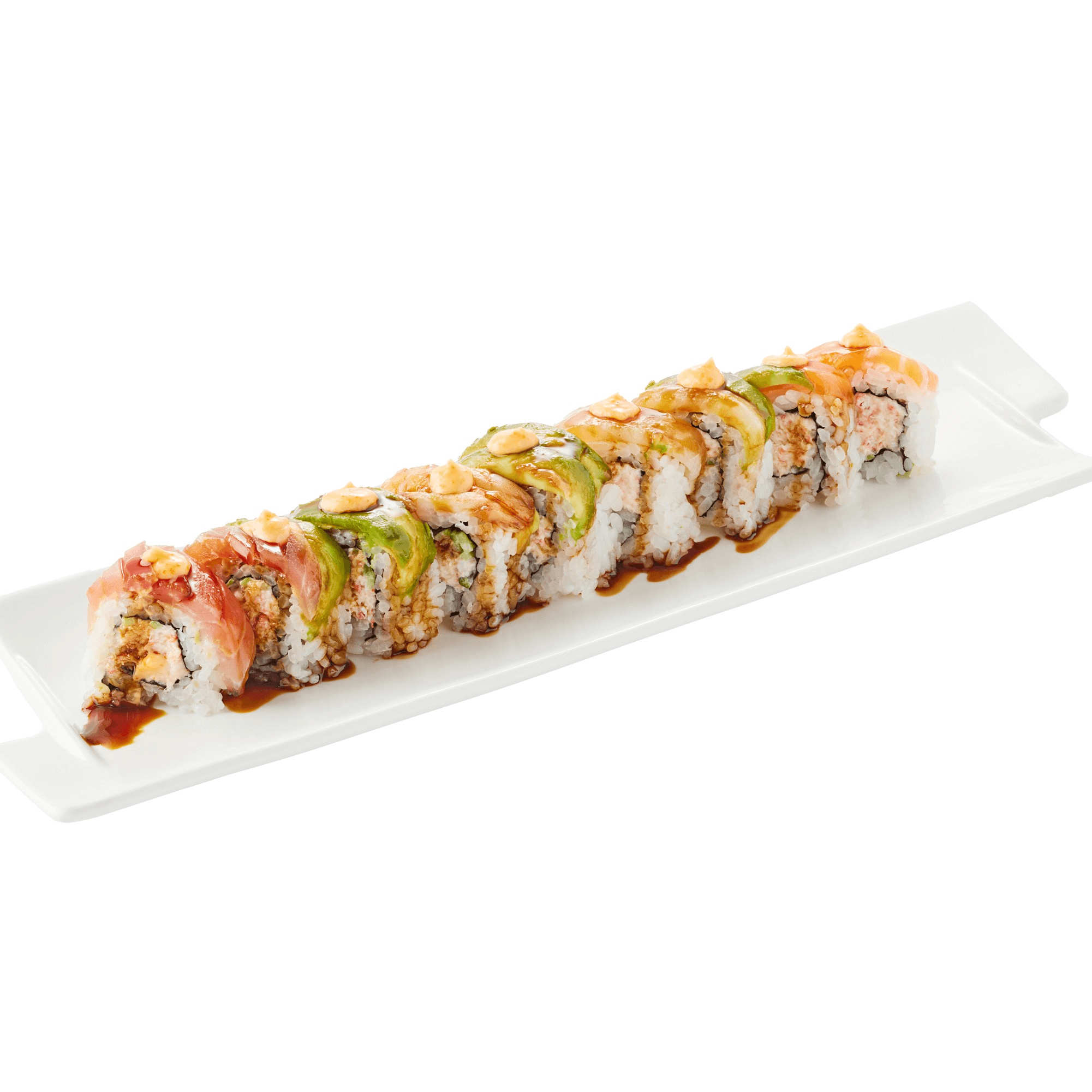 10 pieces. Eel and cucumber base with avocado, eel sauce, mayonnaise, masago