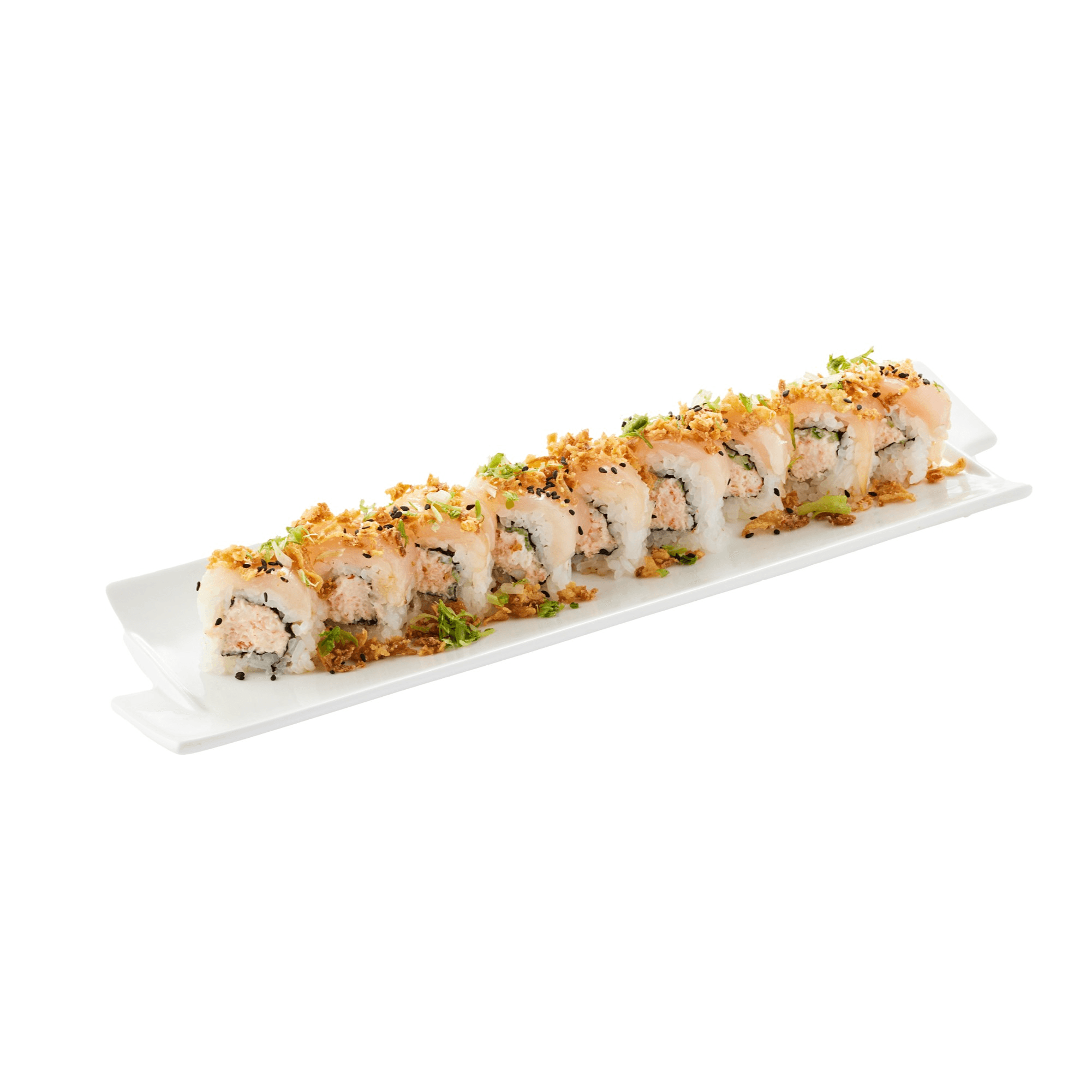 10 pieces. California with albacore, ponzu sauce, black sesame scallion, fried onion