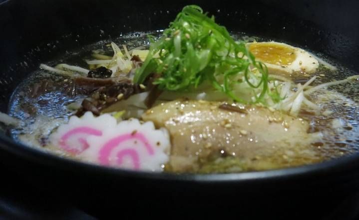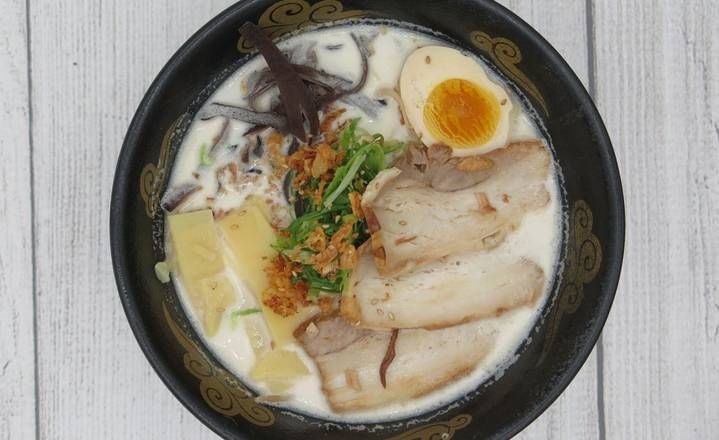 Pork broth with thin noodles, creamy pork broth made by boiled pork bones. Seasoned soft boiled half egg, chashu pork, bean sprouts, sesame seeds, menma, fried onion, and green onion