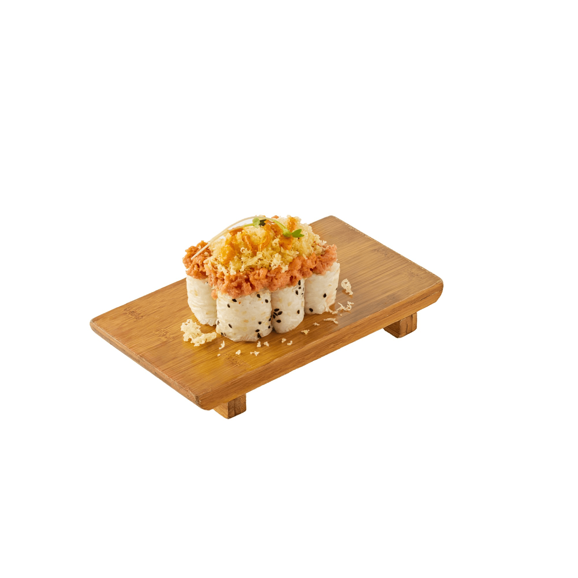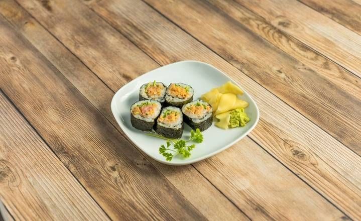 6 pieces. California wrapped with soy paper with spicy tuna, tempura flakes, tobikko, house mayo, kaiware sprout