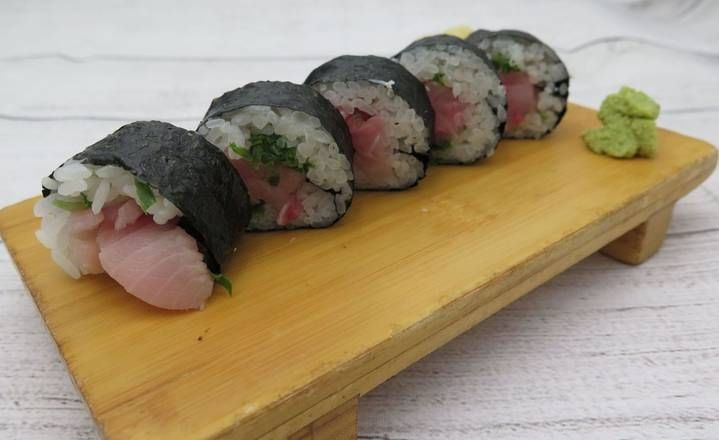 Cucumber and soy paper wrapped with salmon, yellowtail, tuna, and avocado, comes with ginger dressing